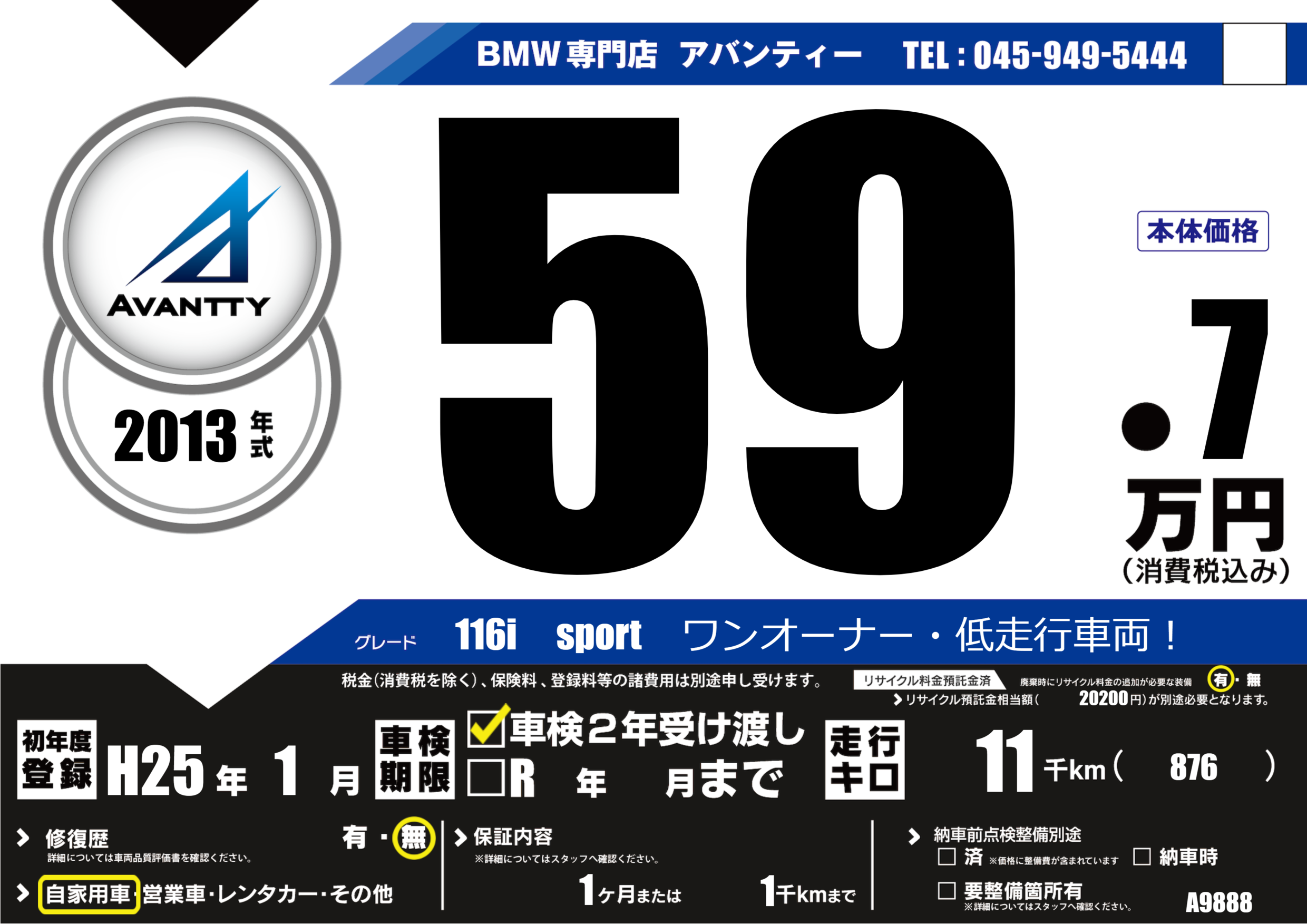 | 走行キロ | 1.1万km | 初年度登録 | H25年1月 |