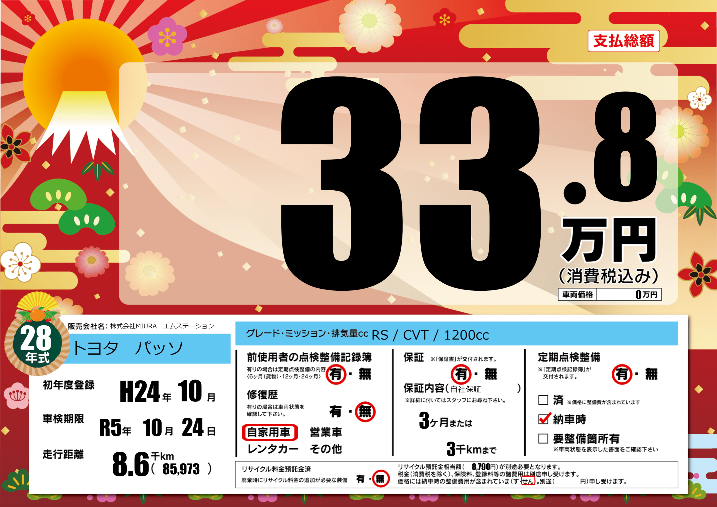 | 車名 | トヨタ パッソ | グレード ミッション 排気量 |