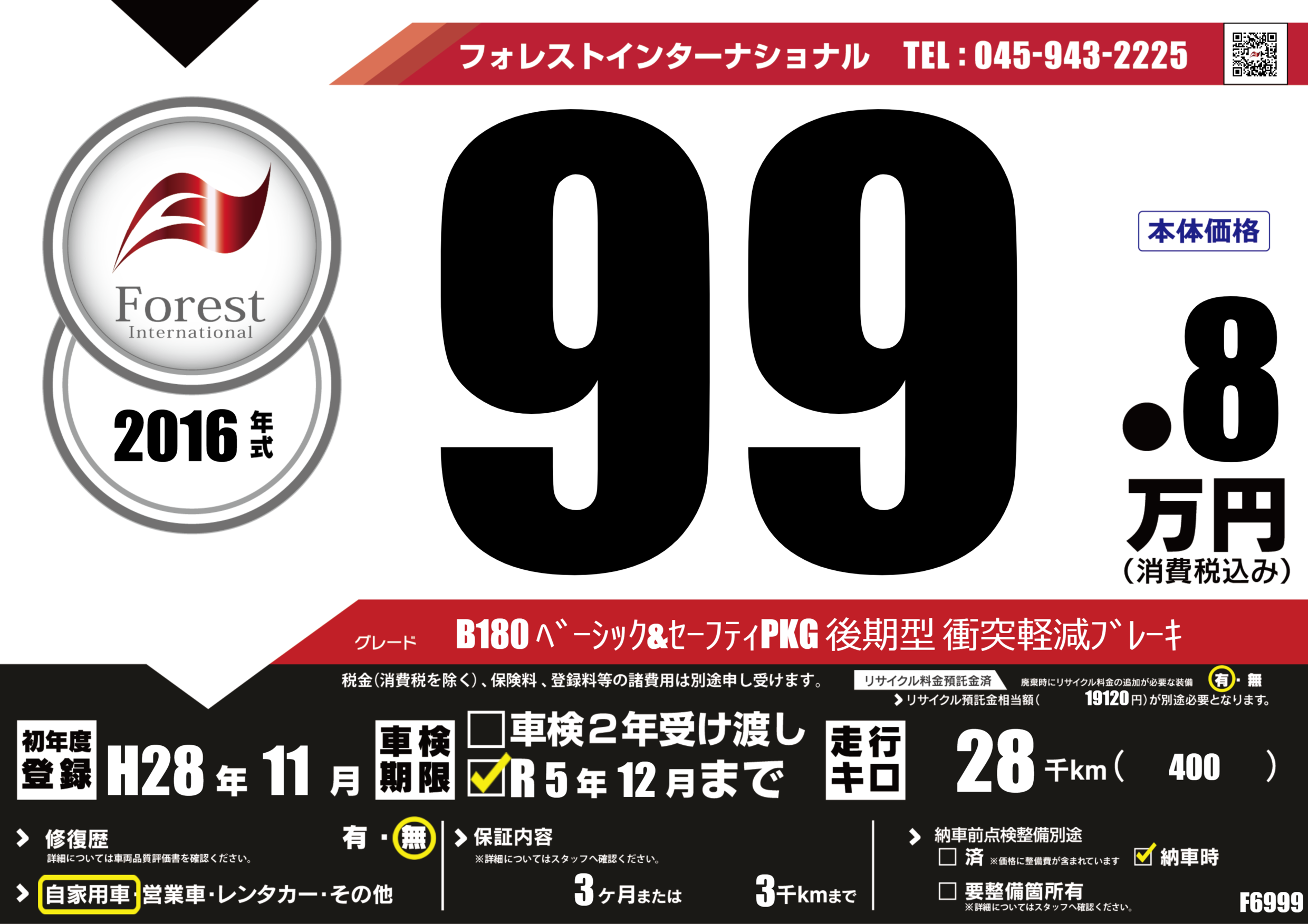 | 走行キロ | 2.8万km | 初年度登録 | H28年11月 |