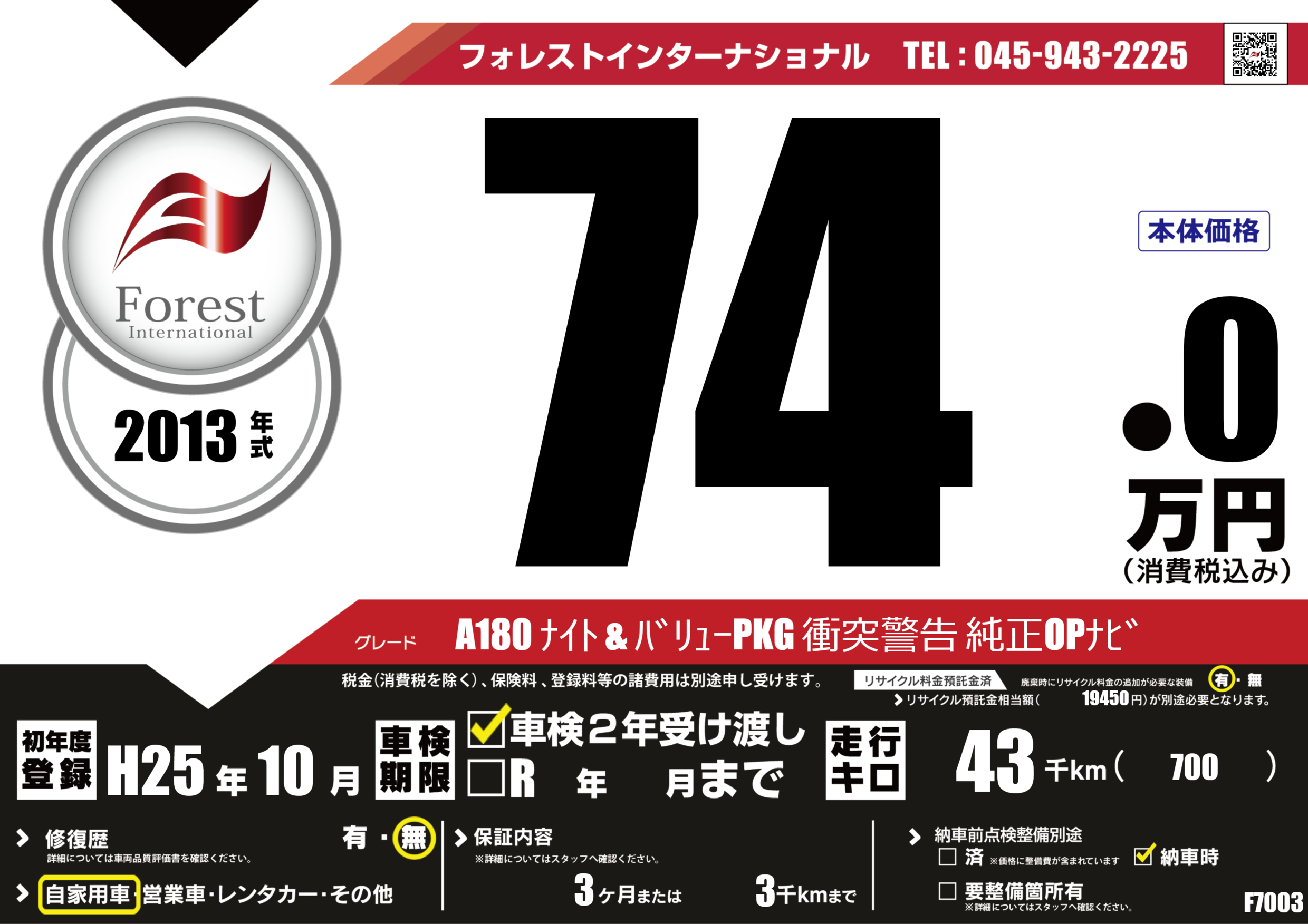 A180 ナイト & バリューPKG 衝突警告 純正OPナビ |