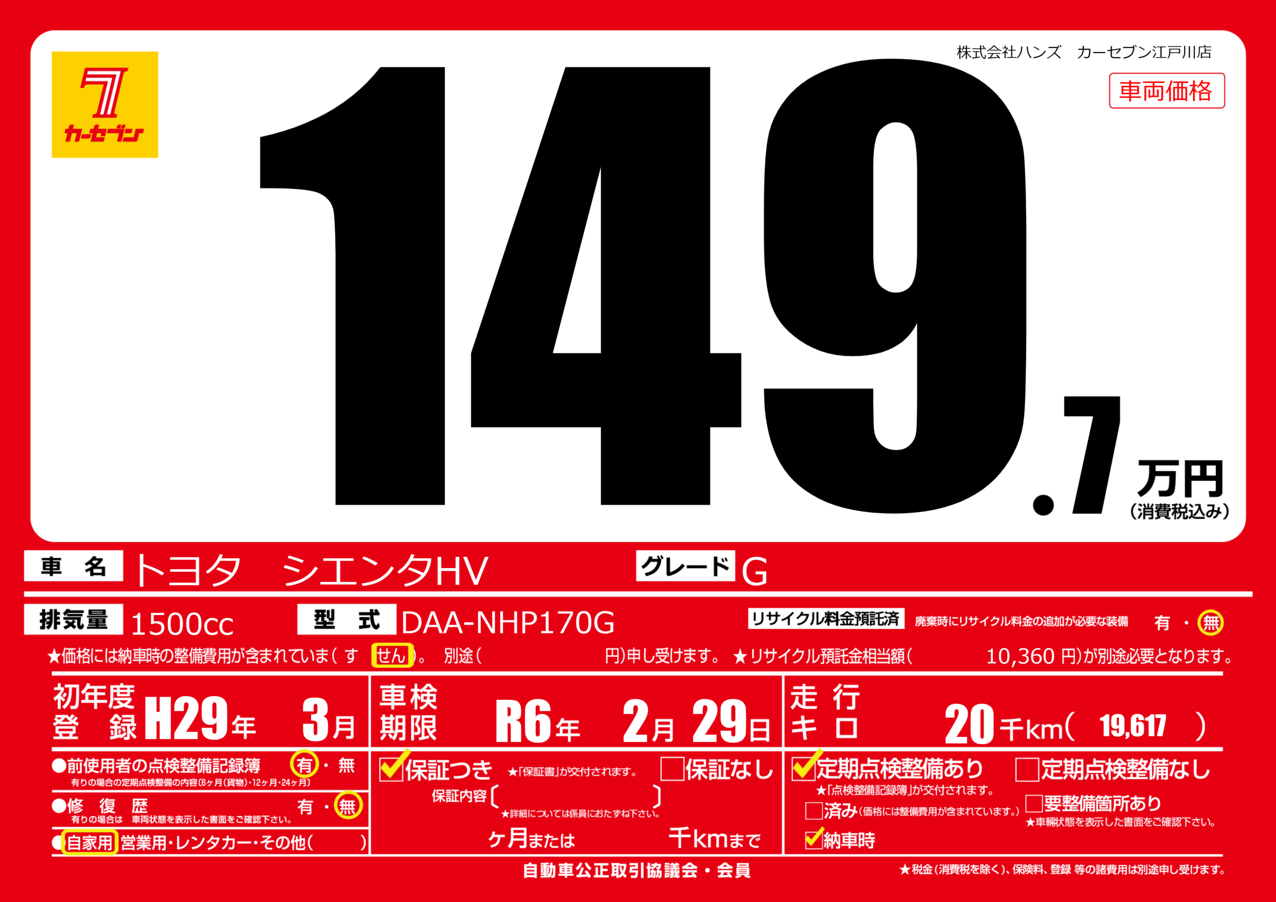 | 車名 | トヨタ シエンタHV | グレード ミッション 排気量 |