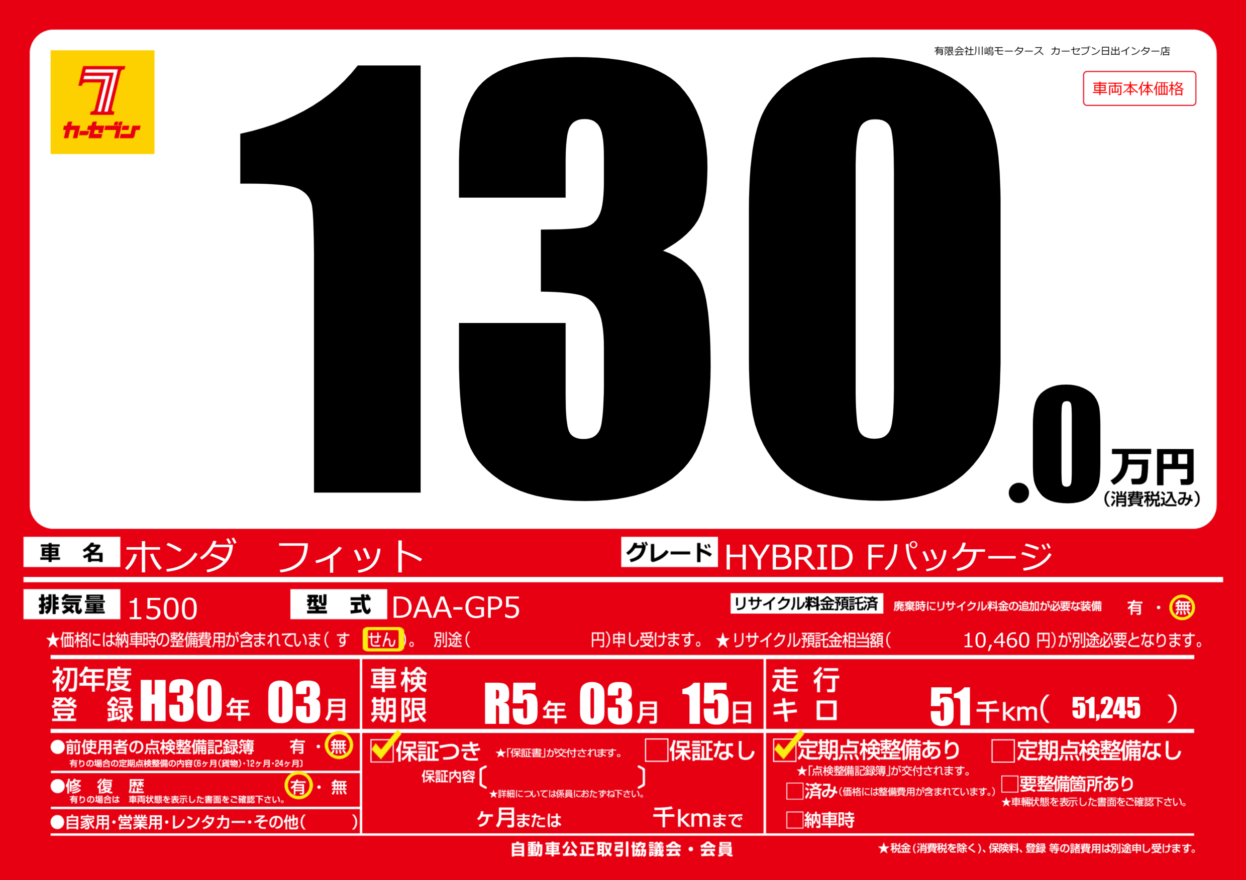 | 車名 | ホンダ フィット | グレード ミッション 排気量 |