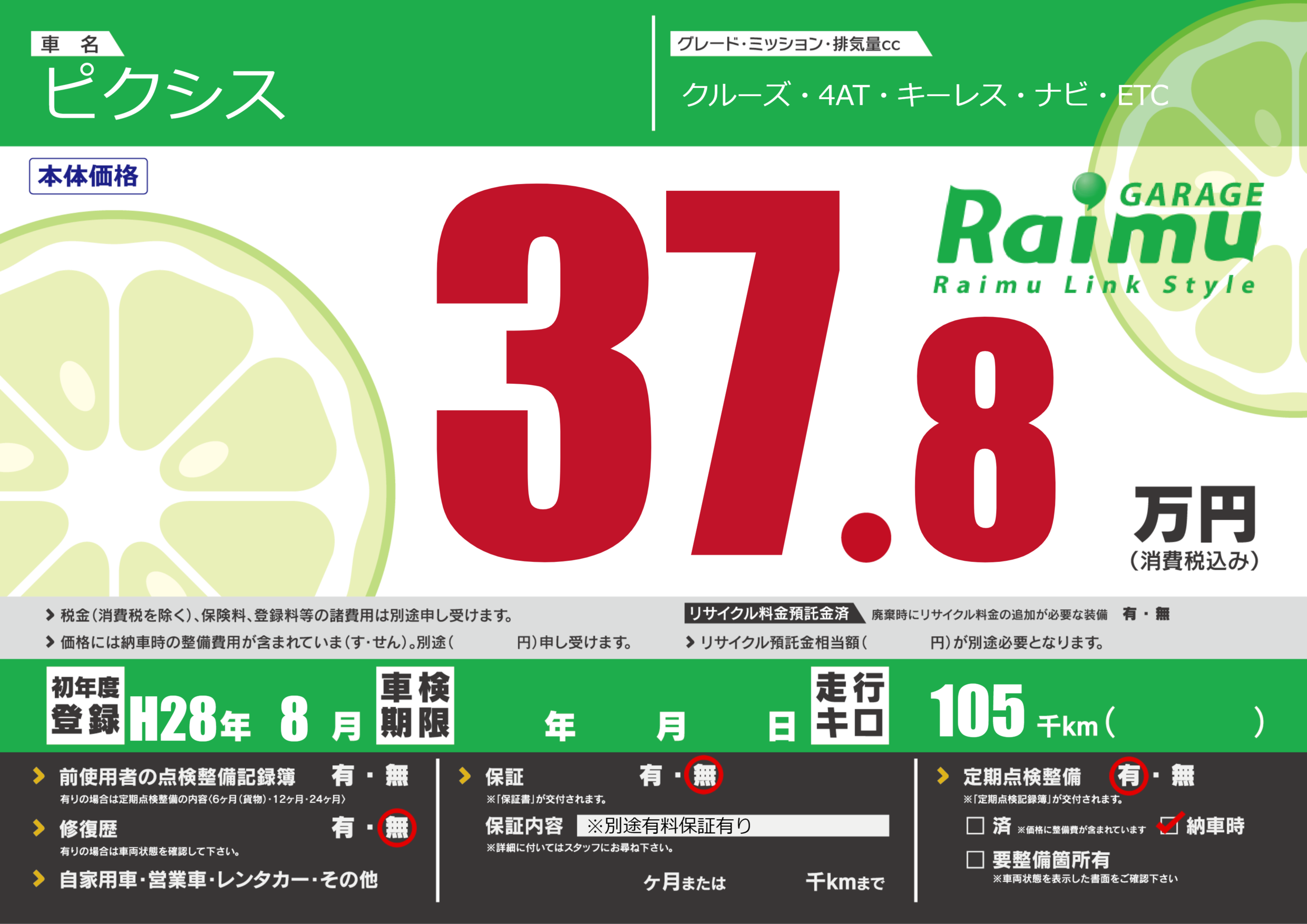 | 車名 | ピクシス | グレード ミッション 排気量 |