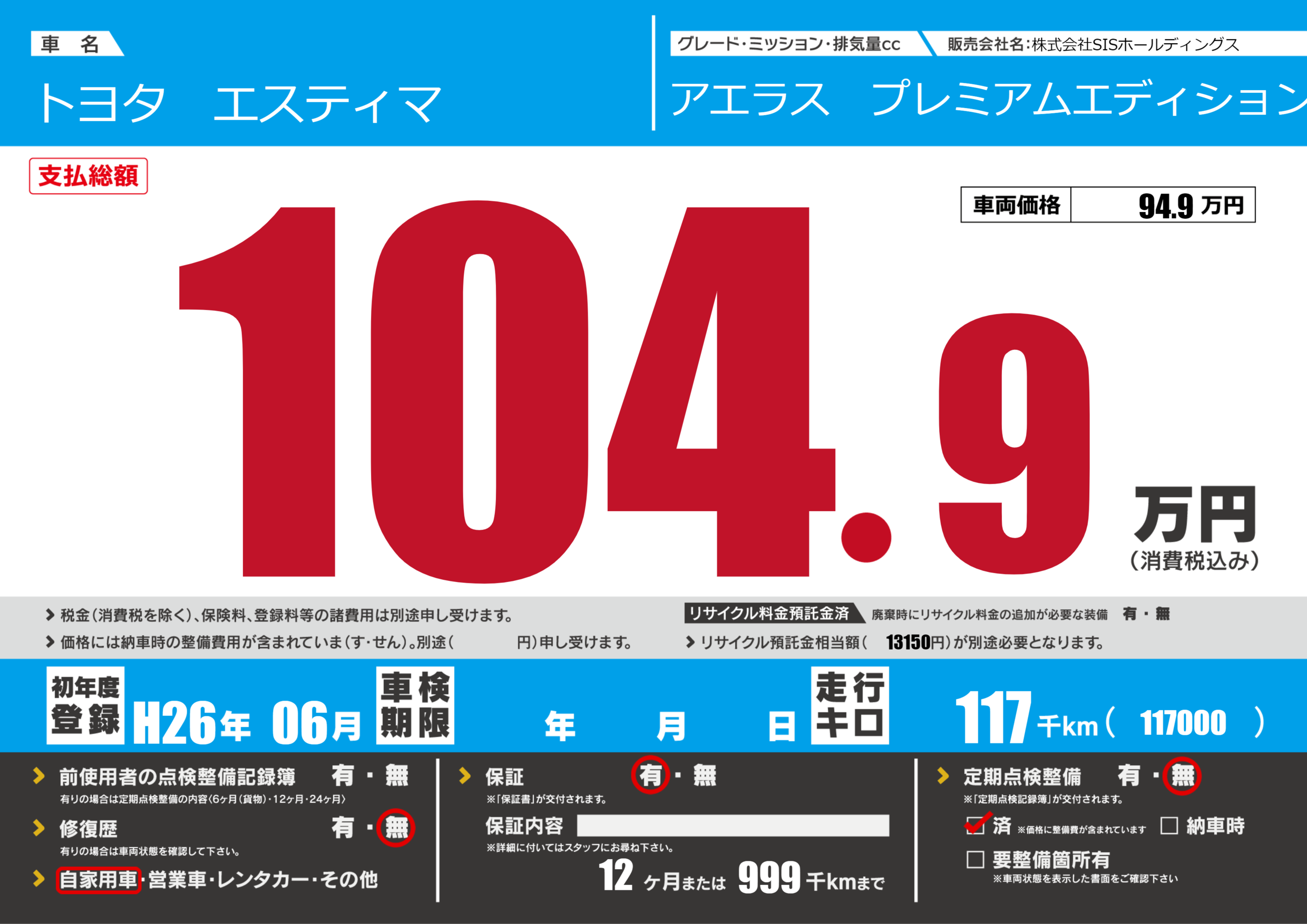 | 定期点検整備 | 定期点検整備なし 定期点検整備済み | ||