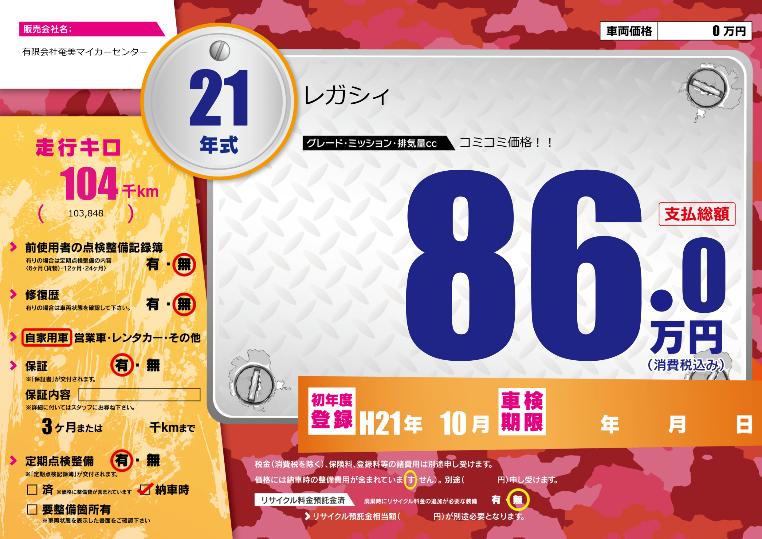 | 車名 | レガシィ | グレード ミッション 排気量 |
