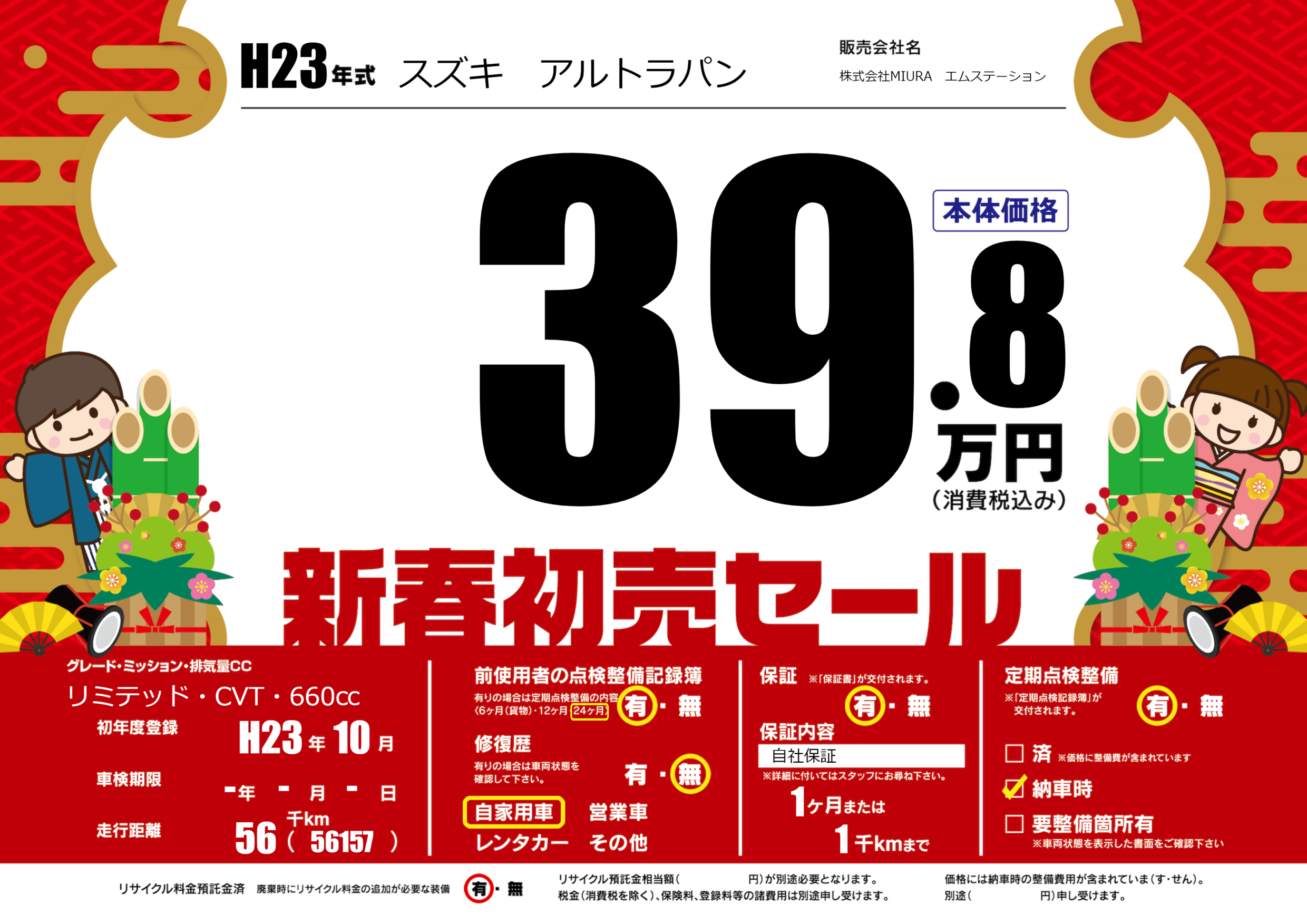 | 定期点検整備 | 定期点検整備あり 納車時あり | ||