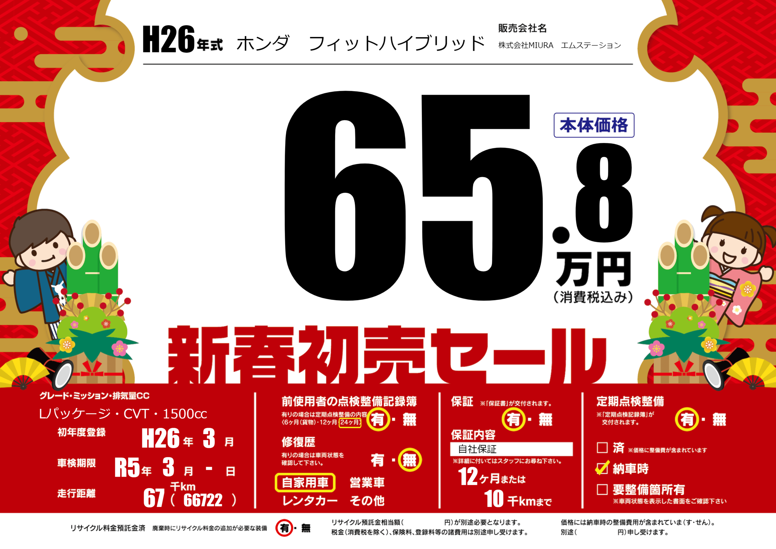 | 走行キロ | 6.7万km | 初年度登録 | H26年3月 |