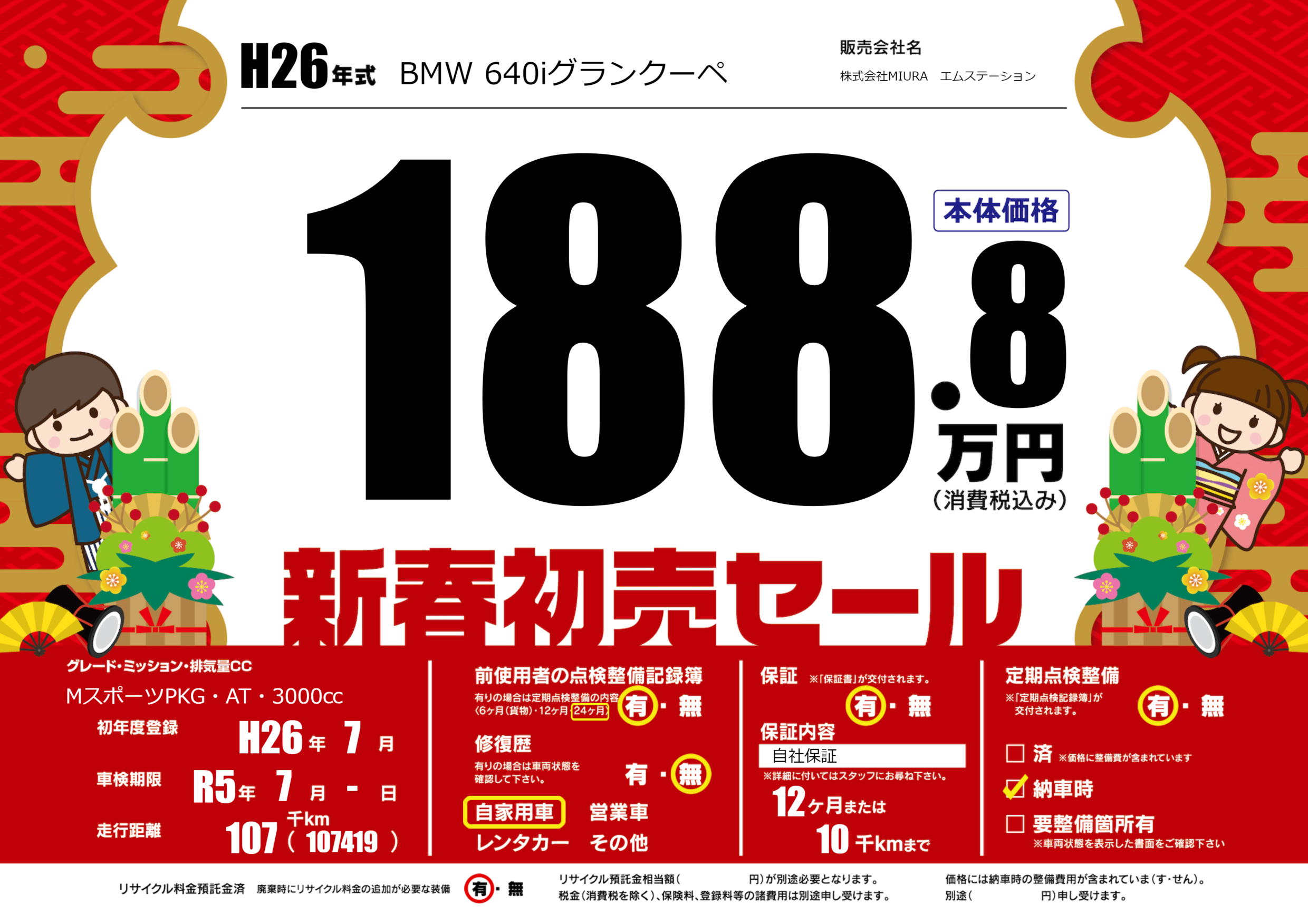 | 車名 | BMW 640iグランクーペ | グレード ミッション 排気量 |