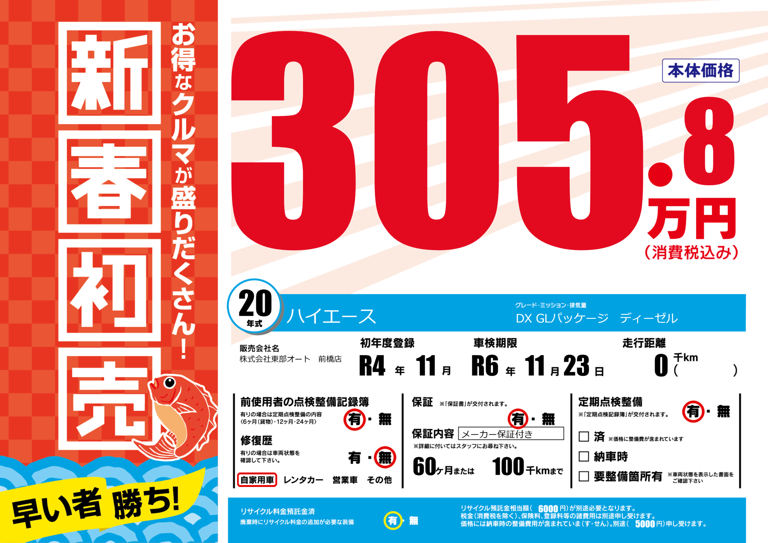 保証付き 保証内容(メーカー保証付き) 60ヶ月または(100)千kmまで |