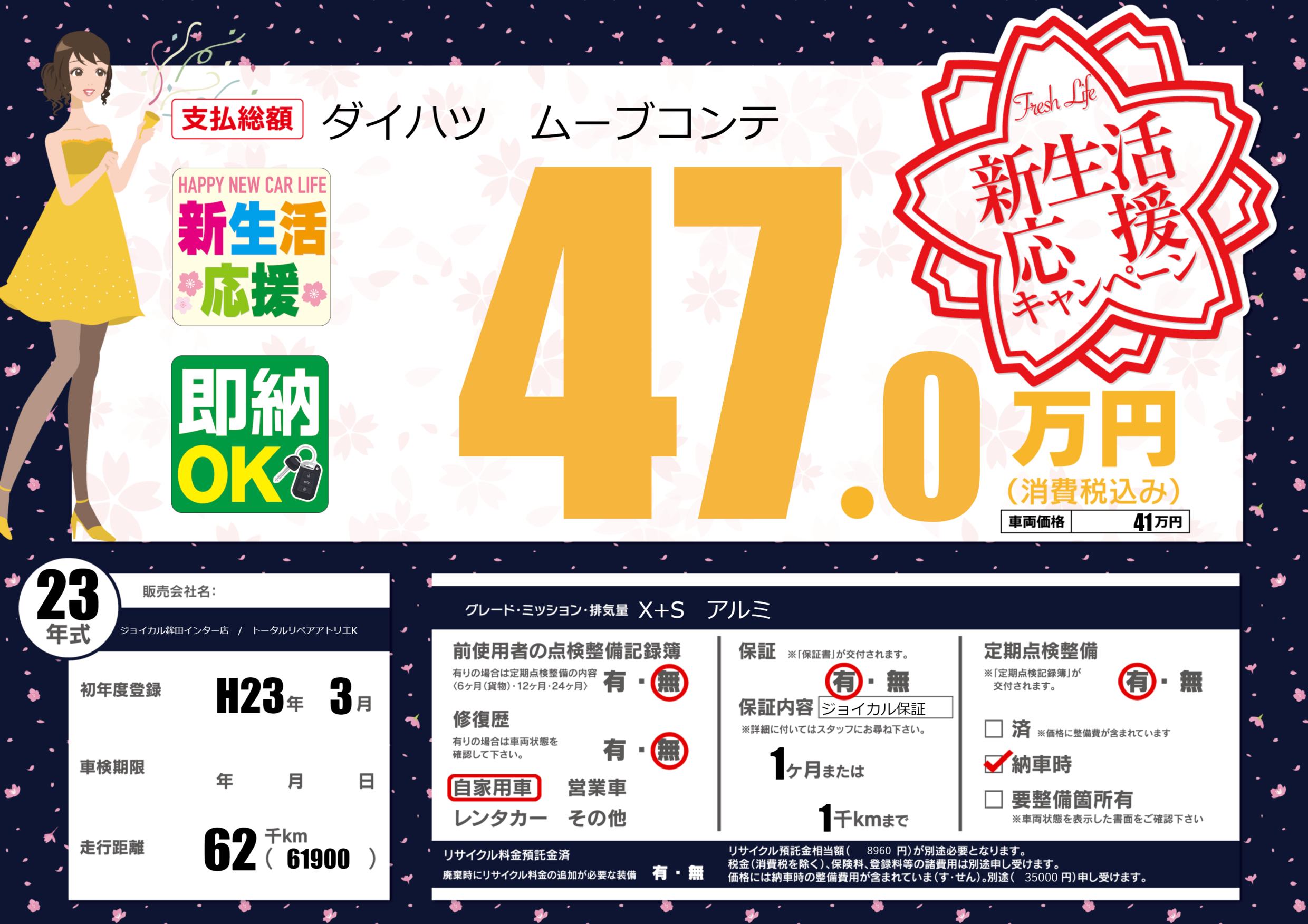 | 走行キロ | 6.2万km | 初年度登録 | H23年3月 |