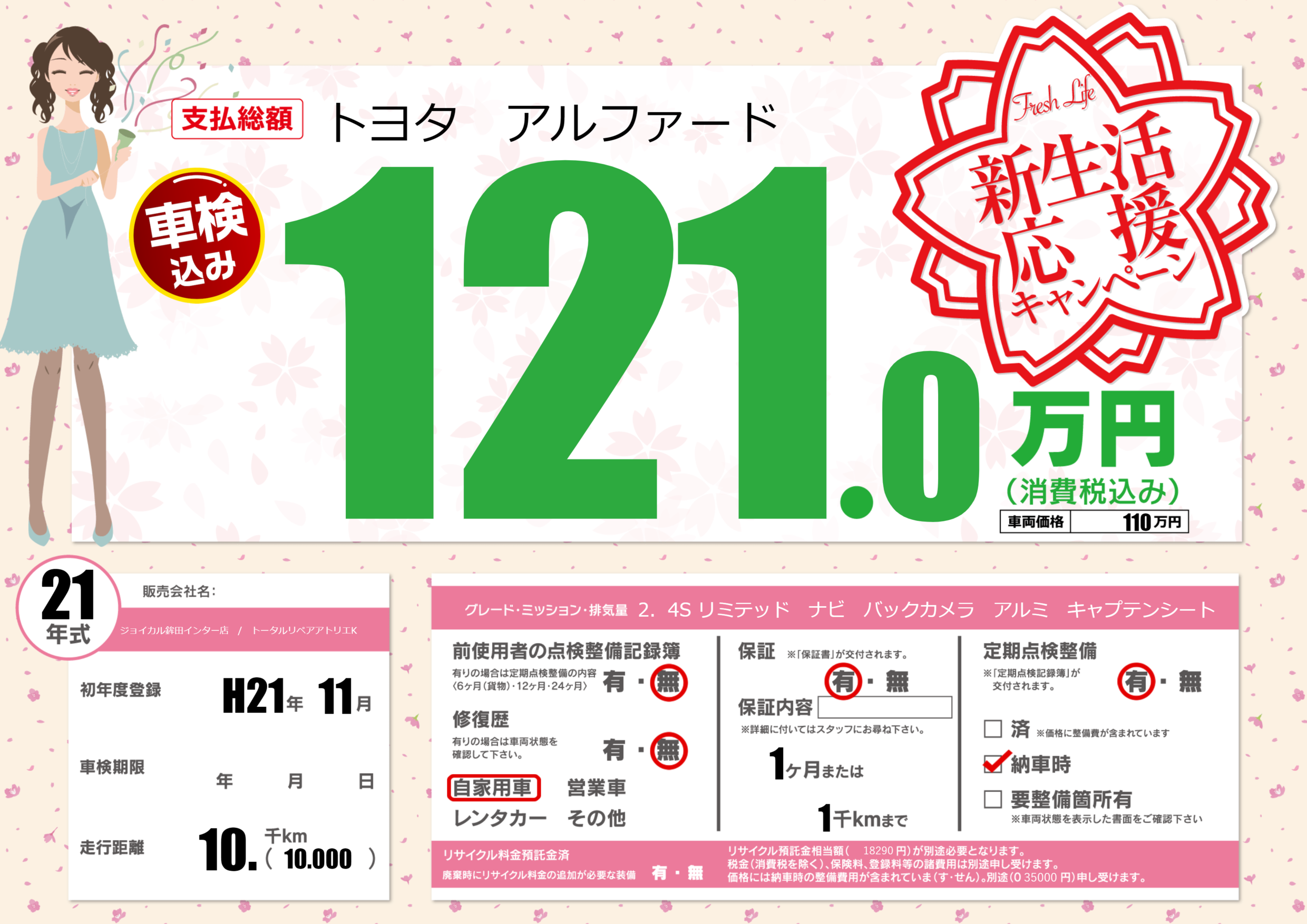 | 車名 | トヨタ アルファード | グレード ミッション 排気量 |