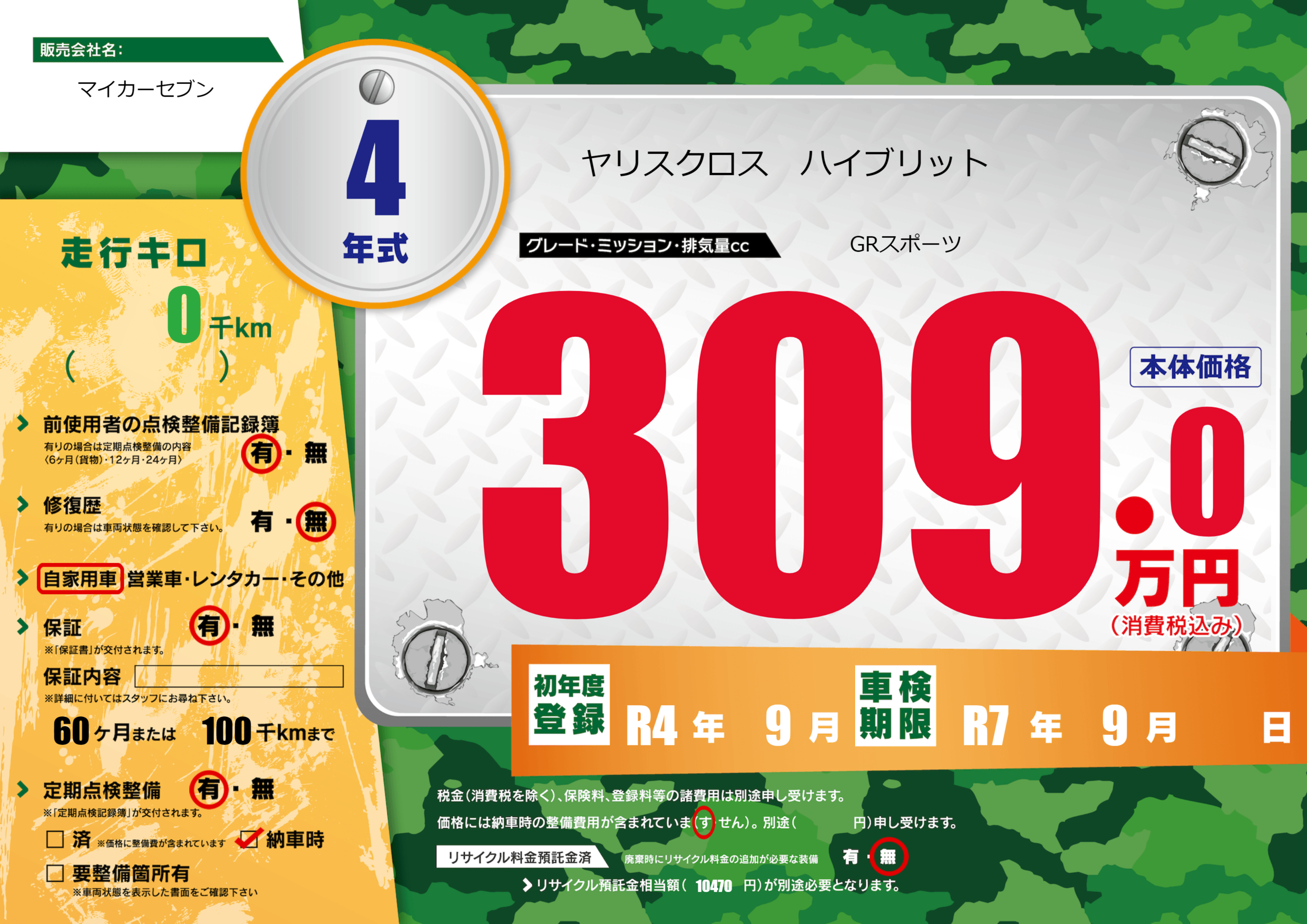 | 車名 | ヤリスクロス ハイブリット | グレード ミッション 排気量 |