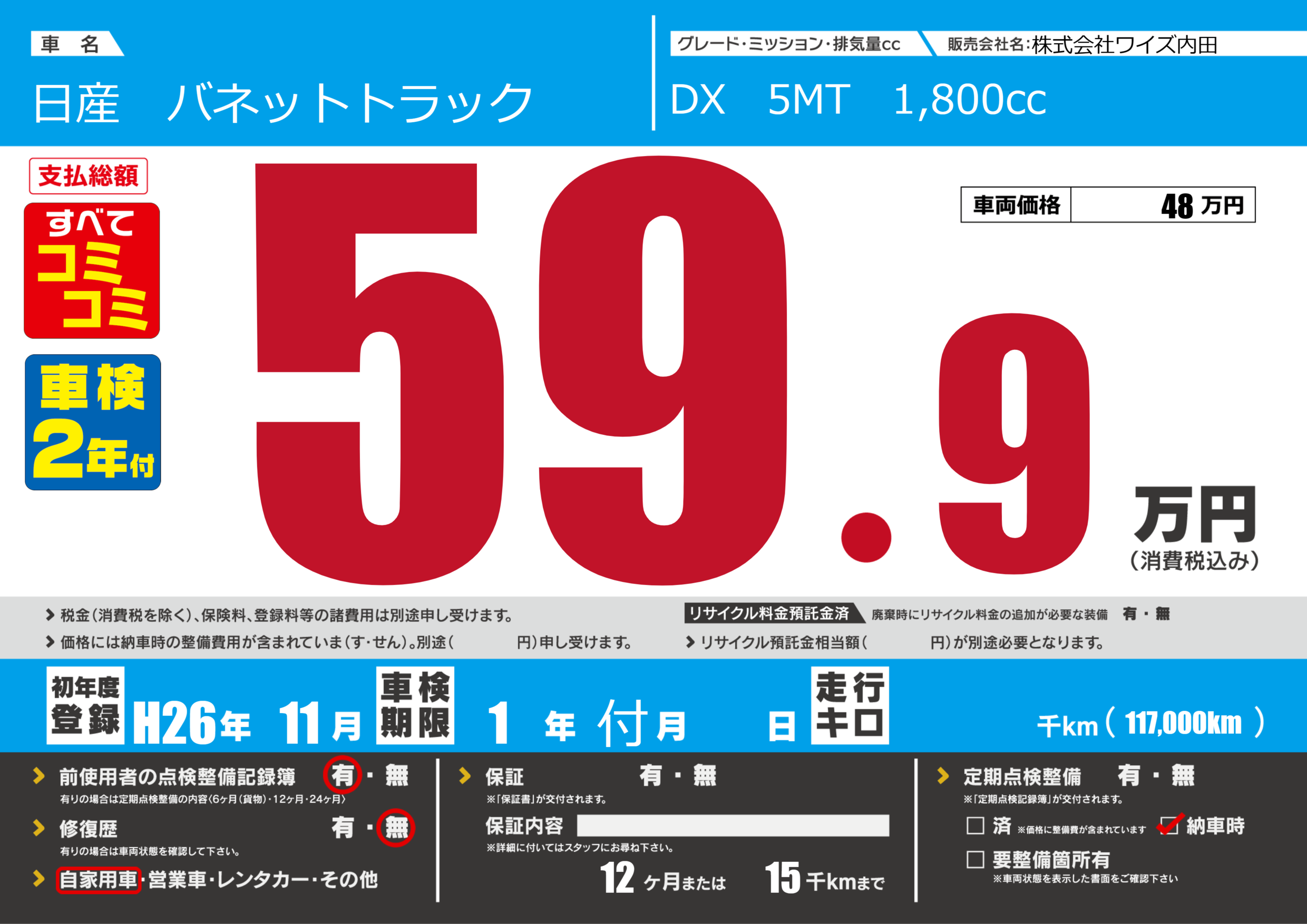 | 車名 | 日産 バネットトラック | グレード ミッション 排気量 |