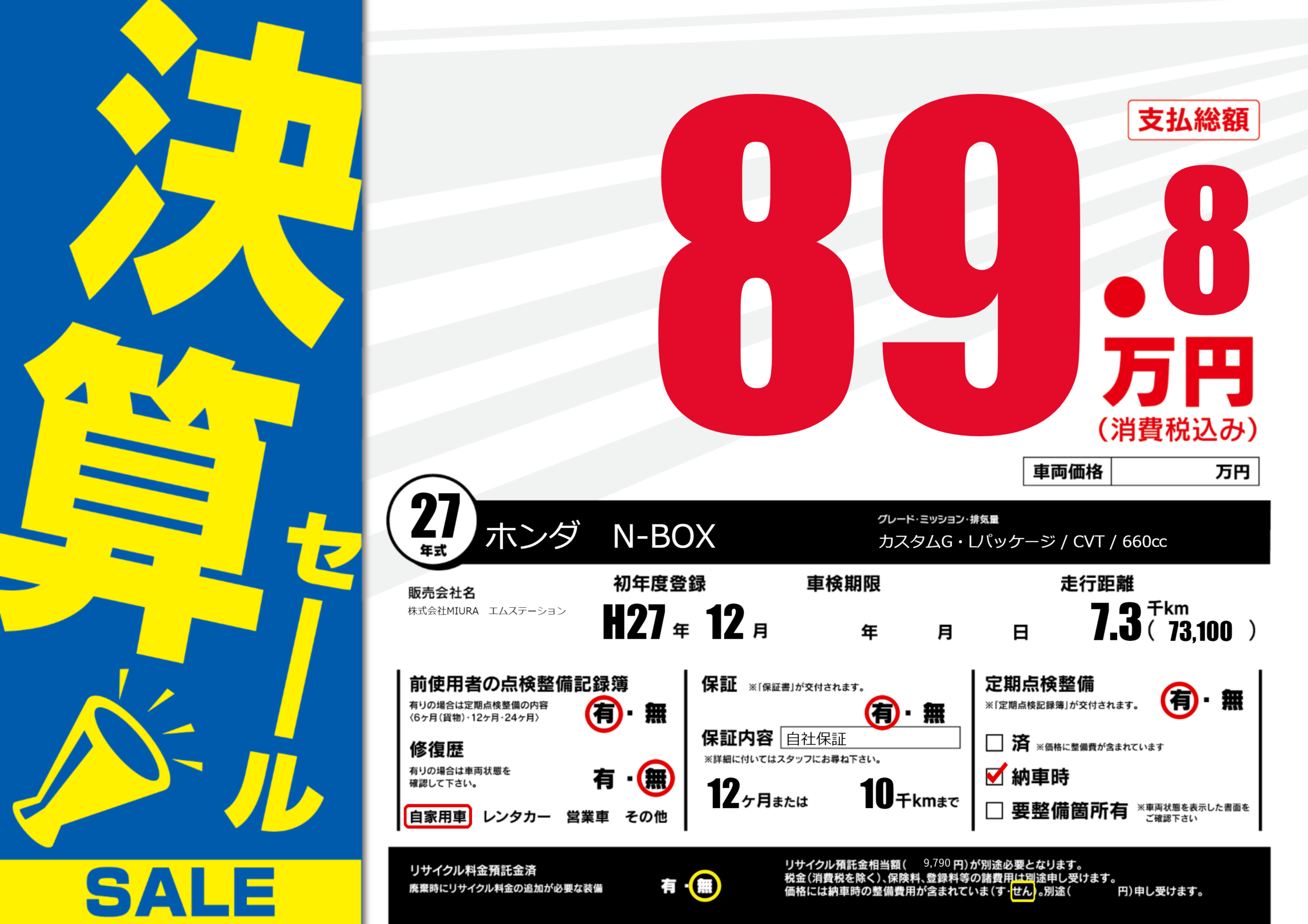 保証付き 保証内容(自社保証) 12ヶ月または(10)千kmまで |