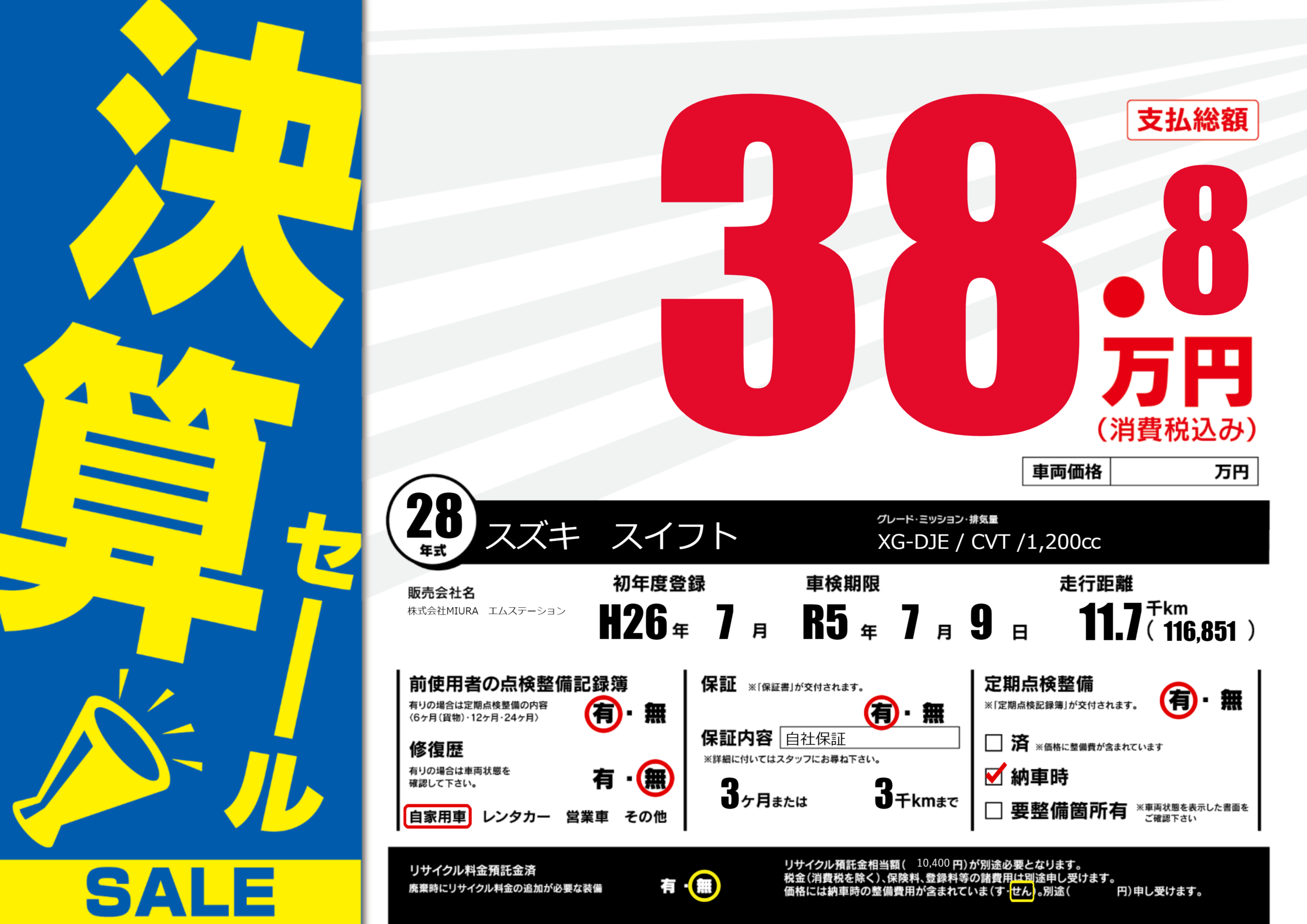 保証付き 保証内容(自社保証) 3ヶ月または(3)千kmまで |