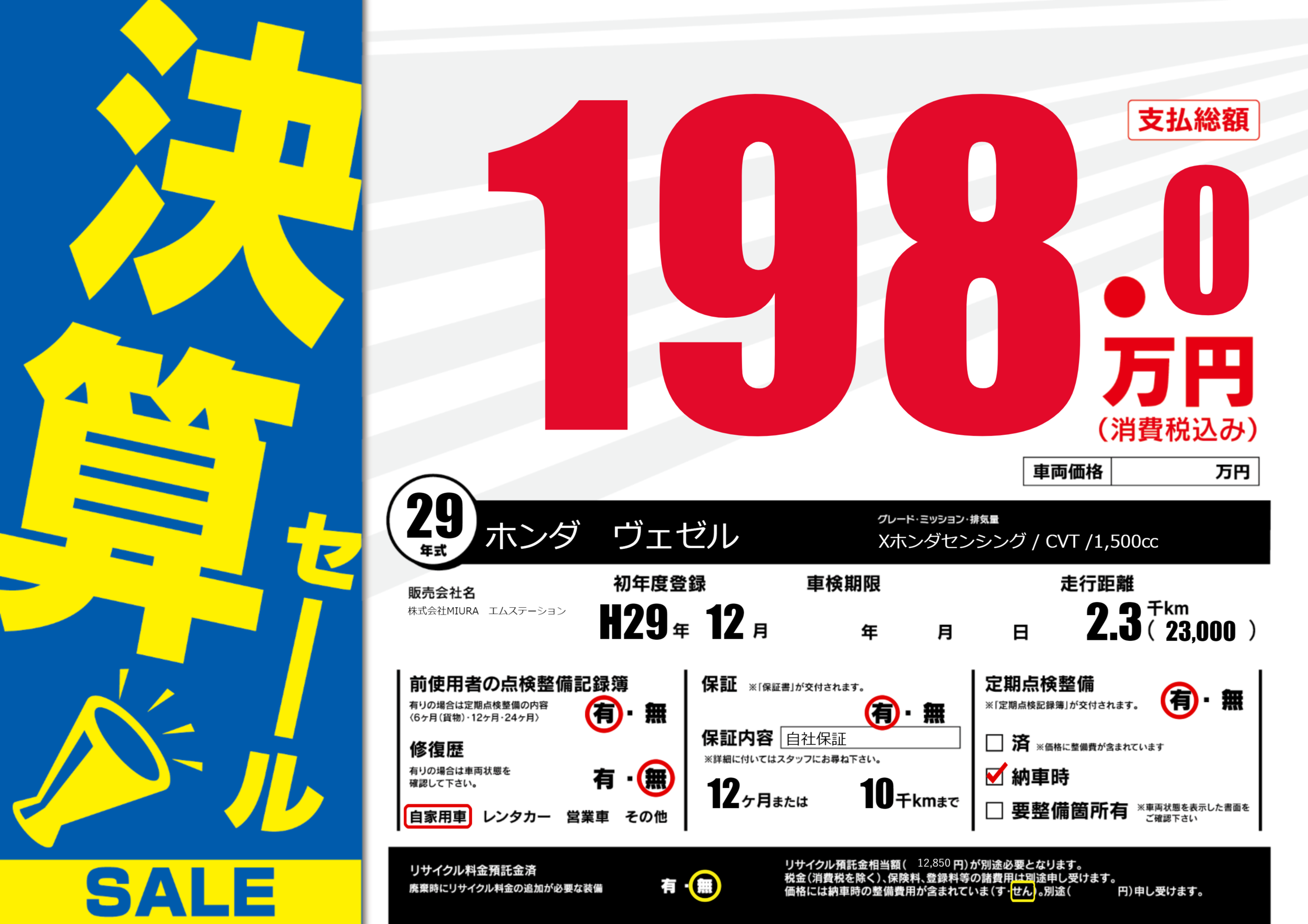 保証付き 保証内容(自社保証) 12ヶ月または(10)千kmまで |