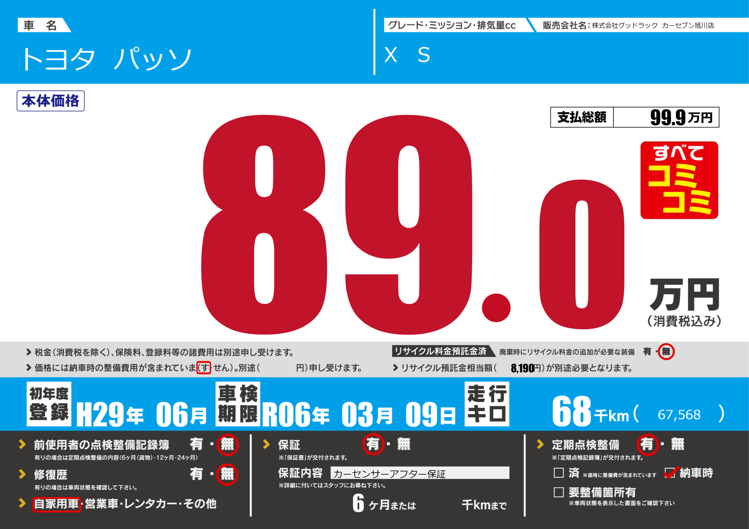 | 車名 | トヨタ パッソ | グレード ミッション 排気量 |