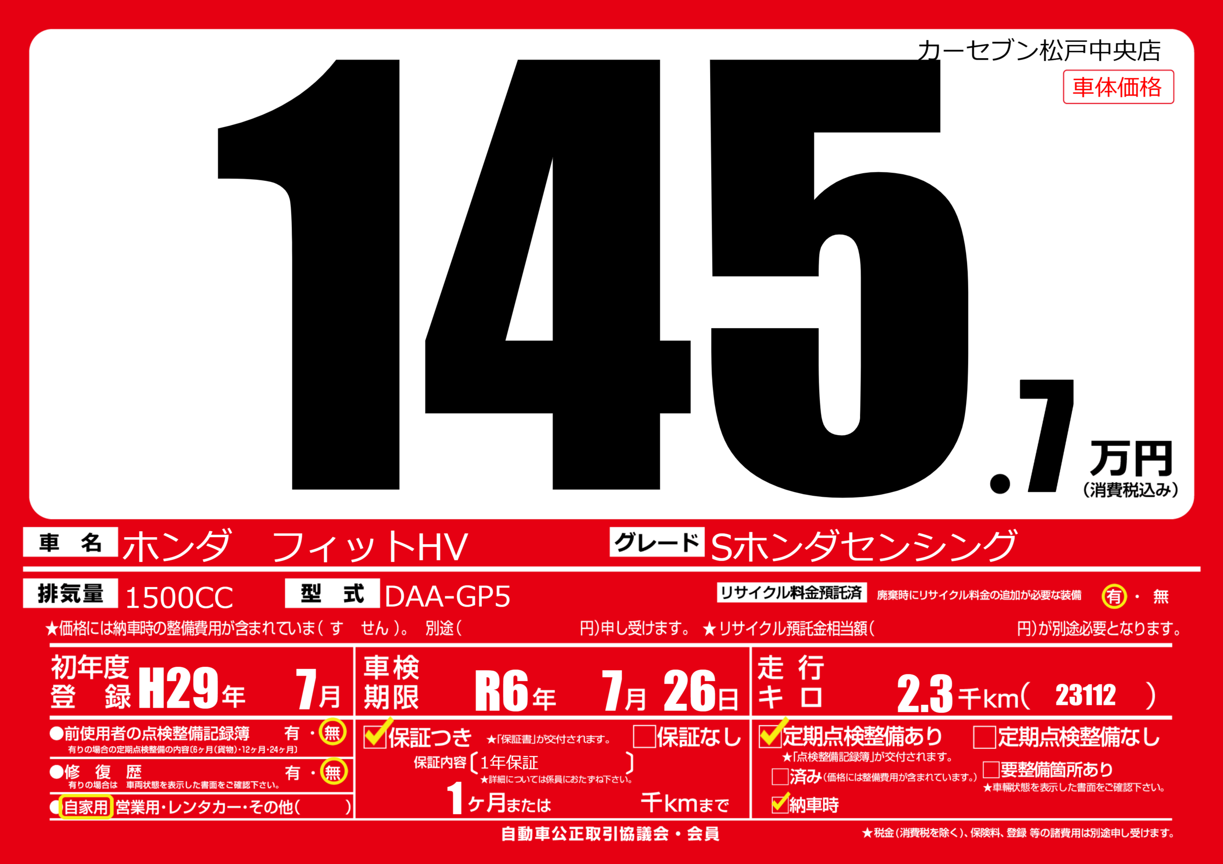 | 車名 | ホンダ フィットHV | グレード ミッション 排気量 |