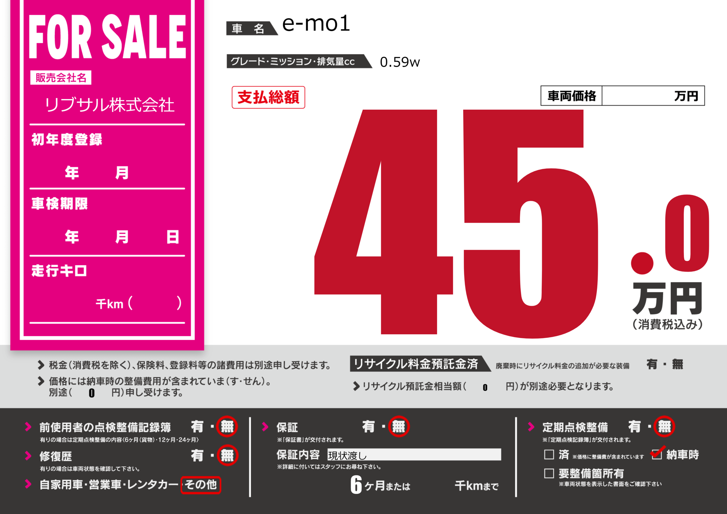 保証なし 保証内容(現状渡し) 6ヶ月または()千kmまで |