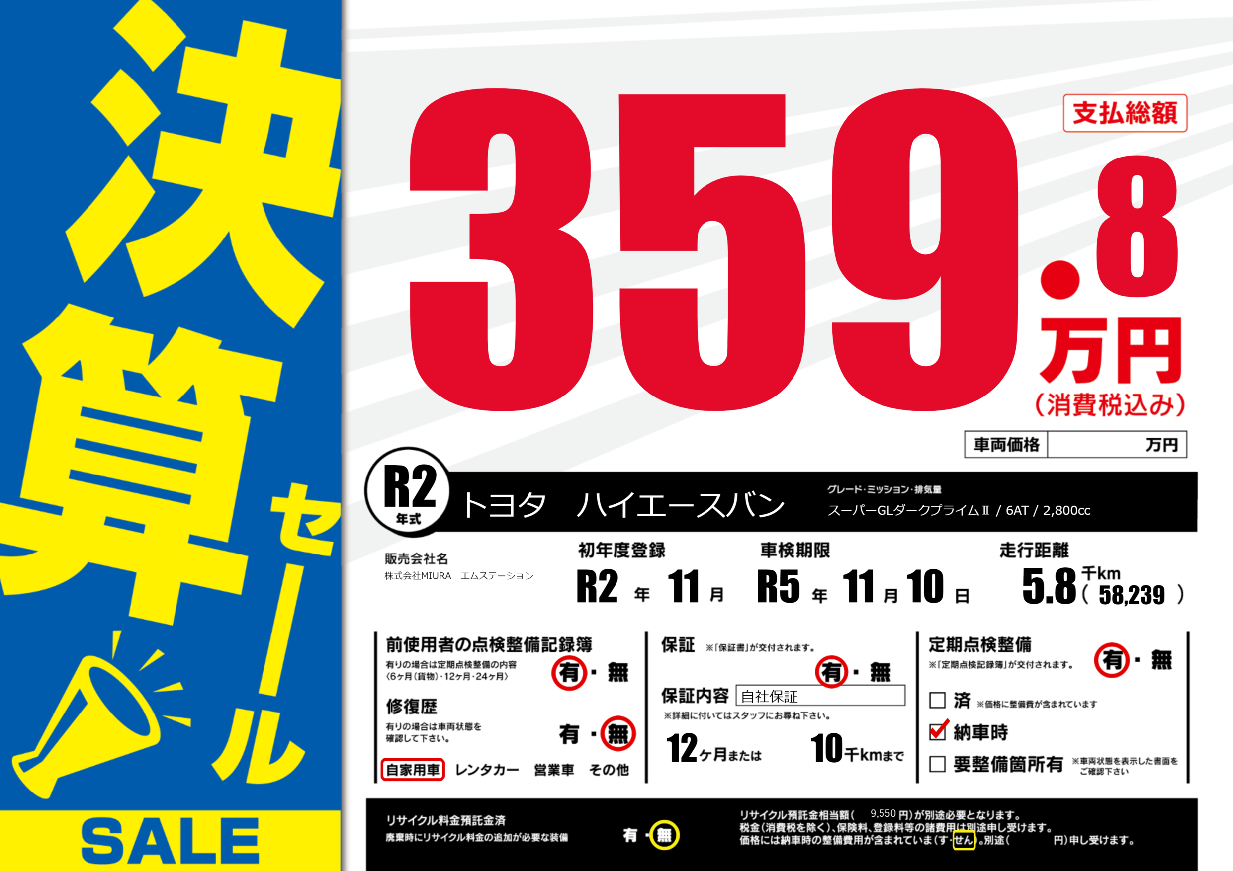 | 定期点検整備 | 定期点検整備あり 納車時あり | ||