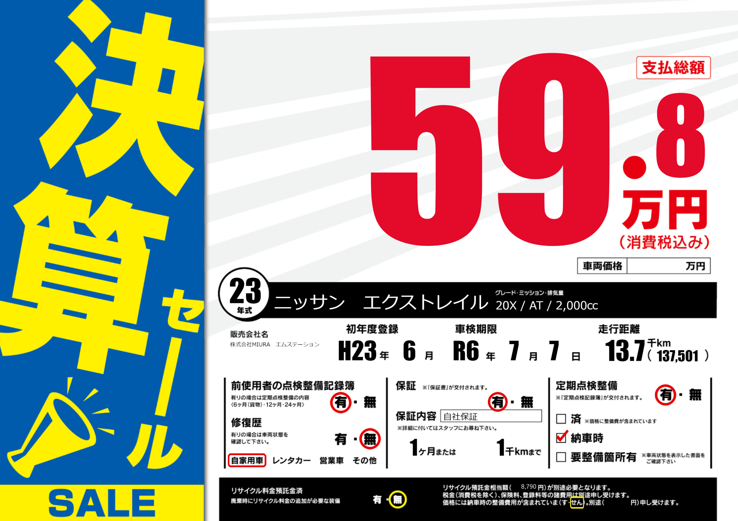 | 定期点検整備 | 定期点検整備あり 納車時あり | ||