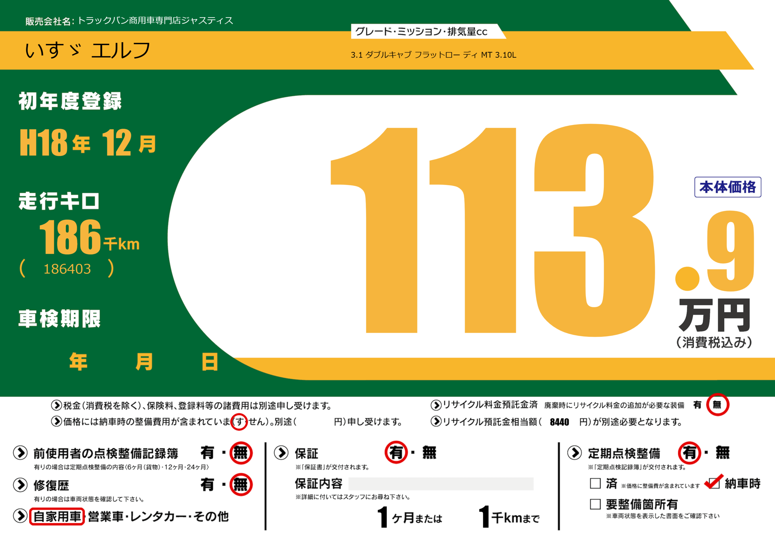 | 走行キロ | 18.6万km | 初年度登録 | H18年12月 |