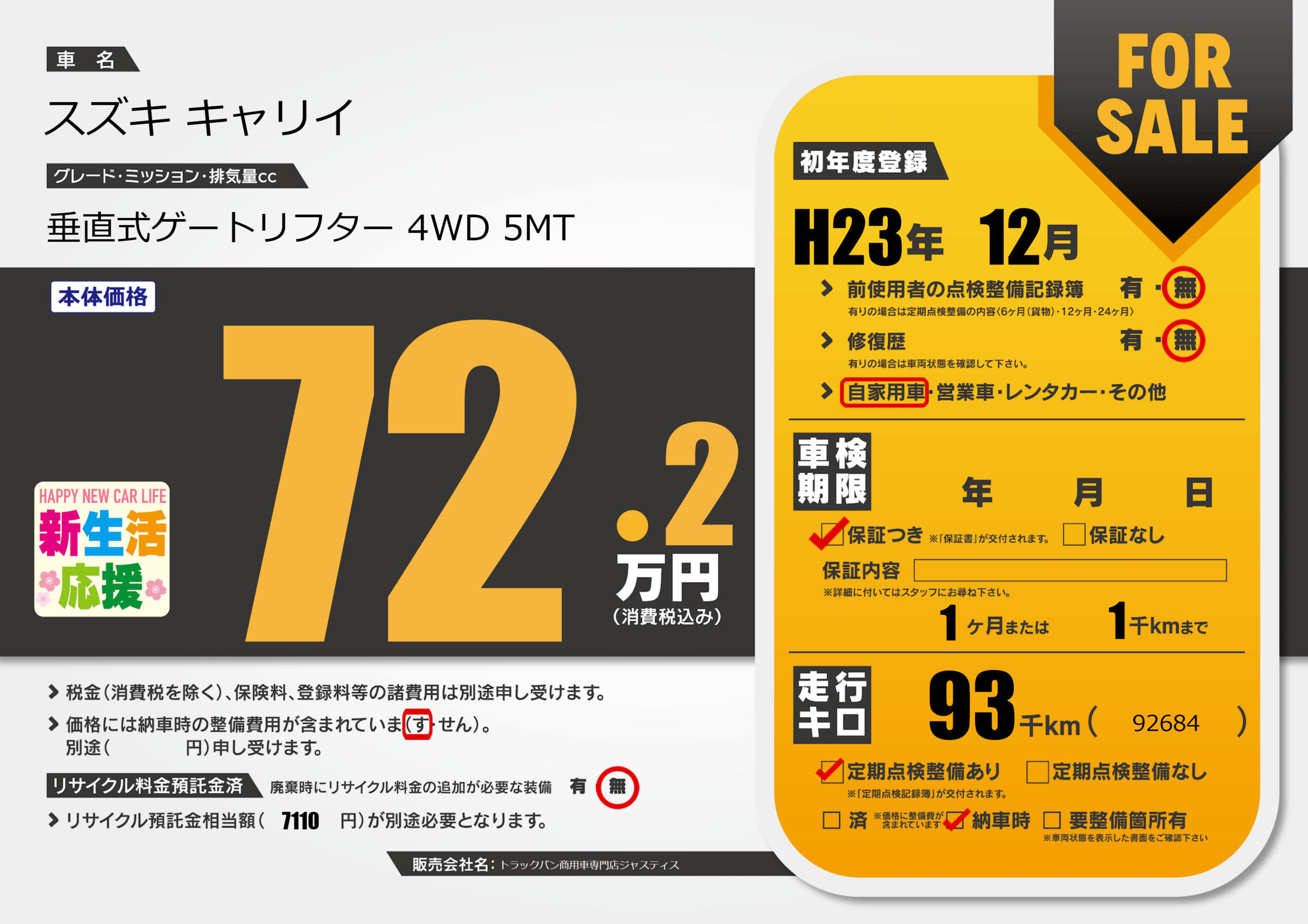 | 車名 | スズキ キャリイ | グレード ミッション 排気量 |