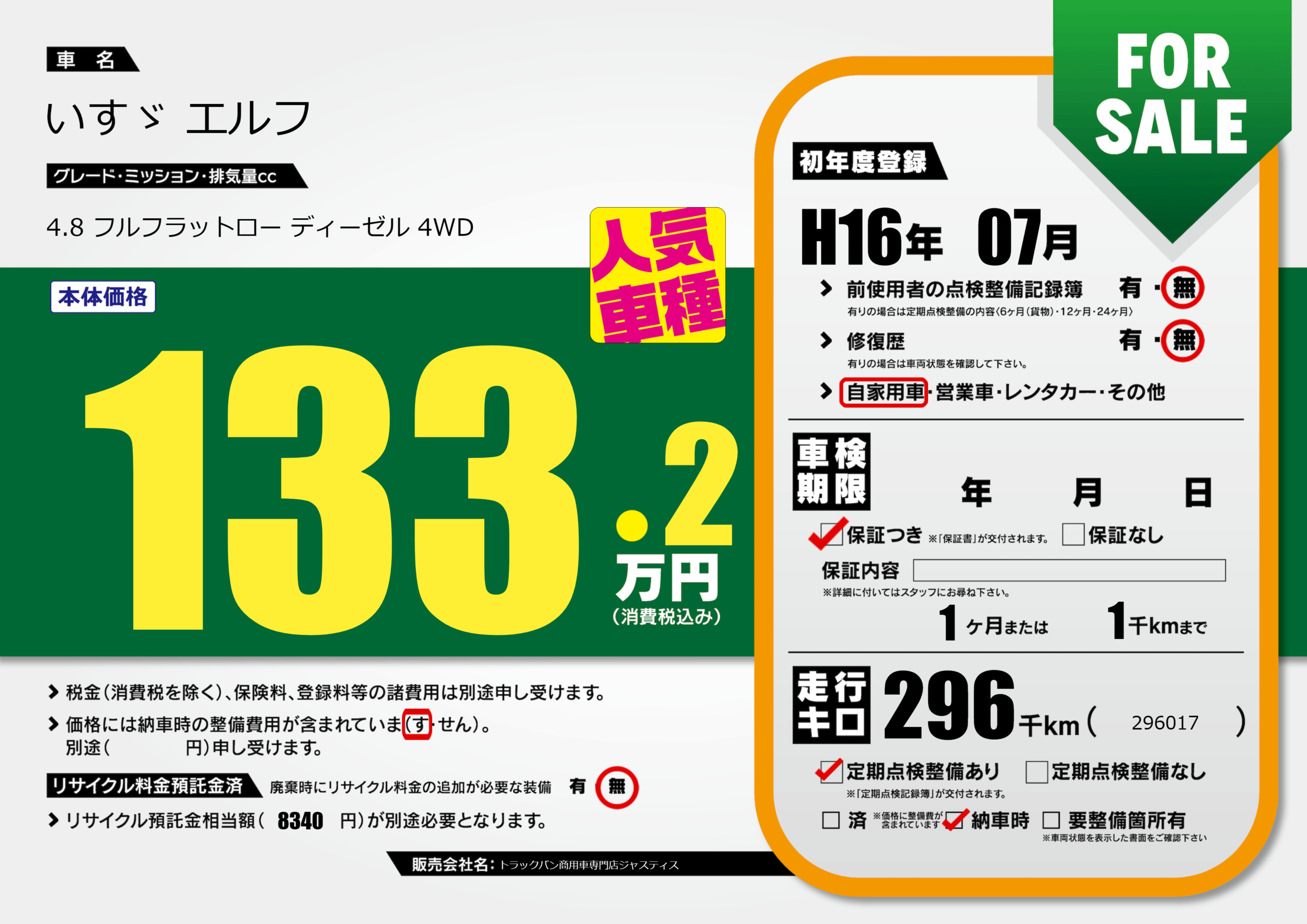| 車名 | いすゞ エルフ | グレード ミッション 排気量 |