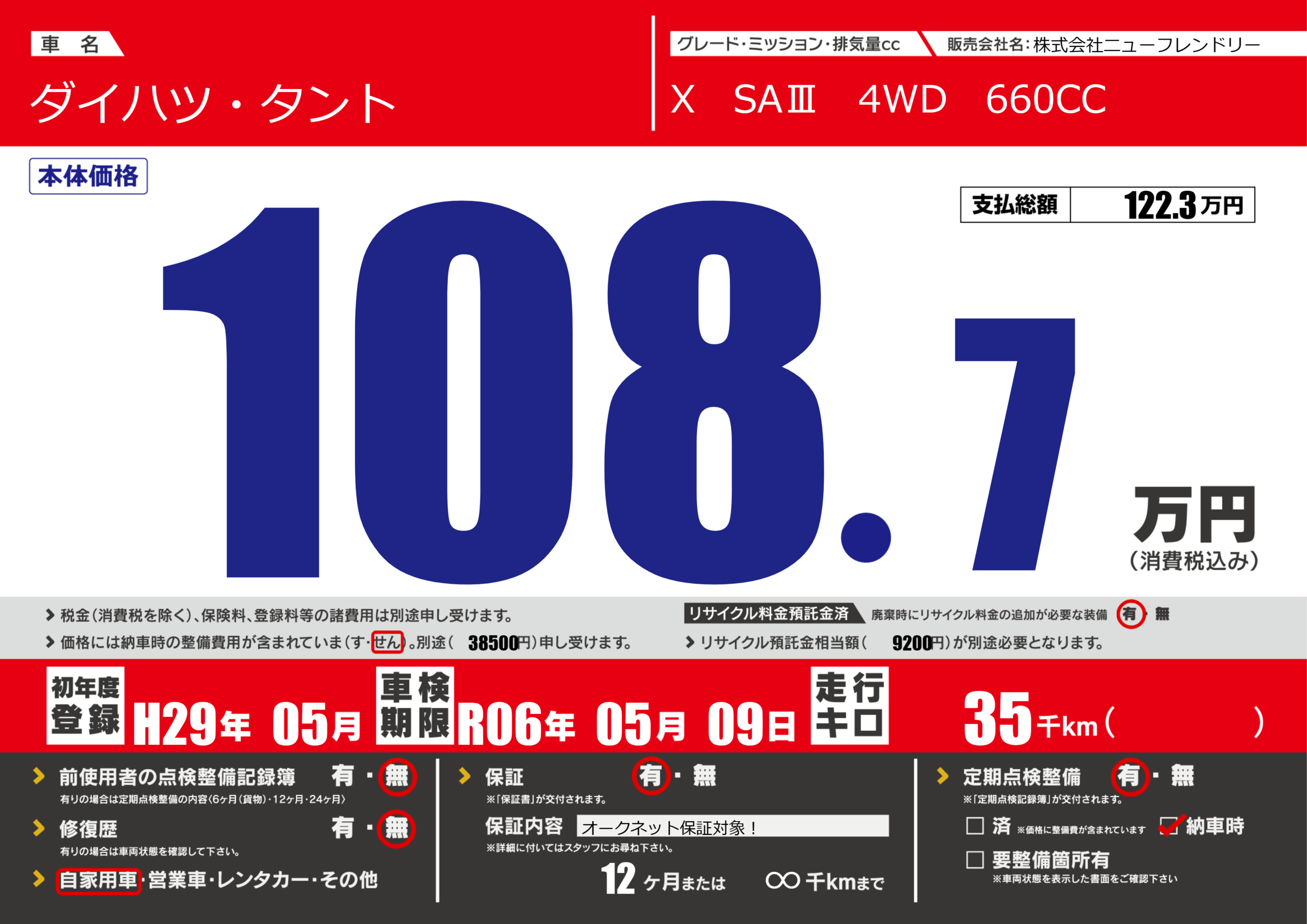 | 車名 | ダイハツ・タント | グレード ミッション 排気量 |
