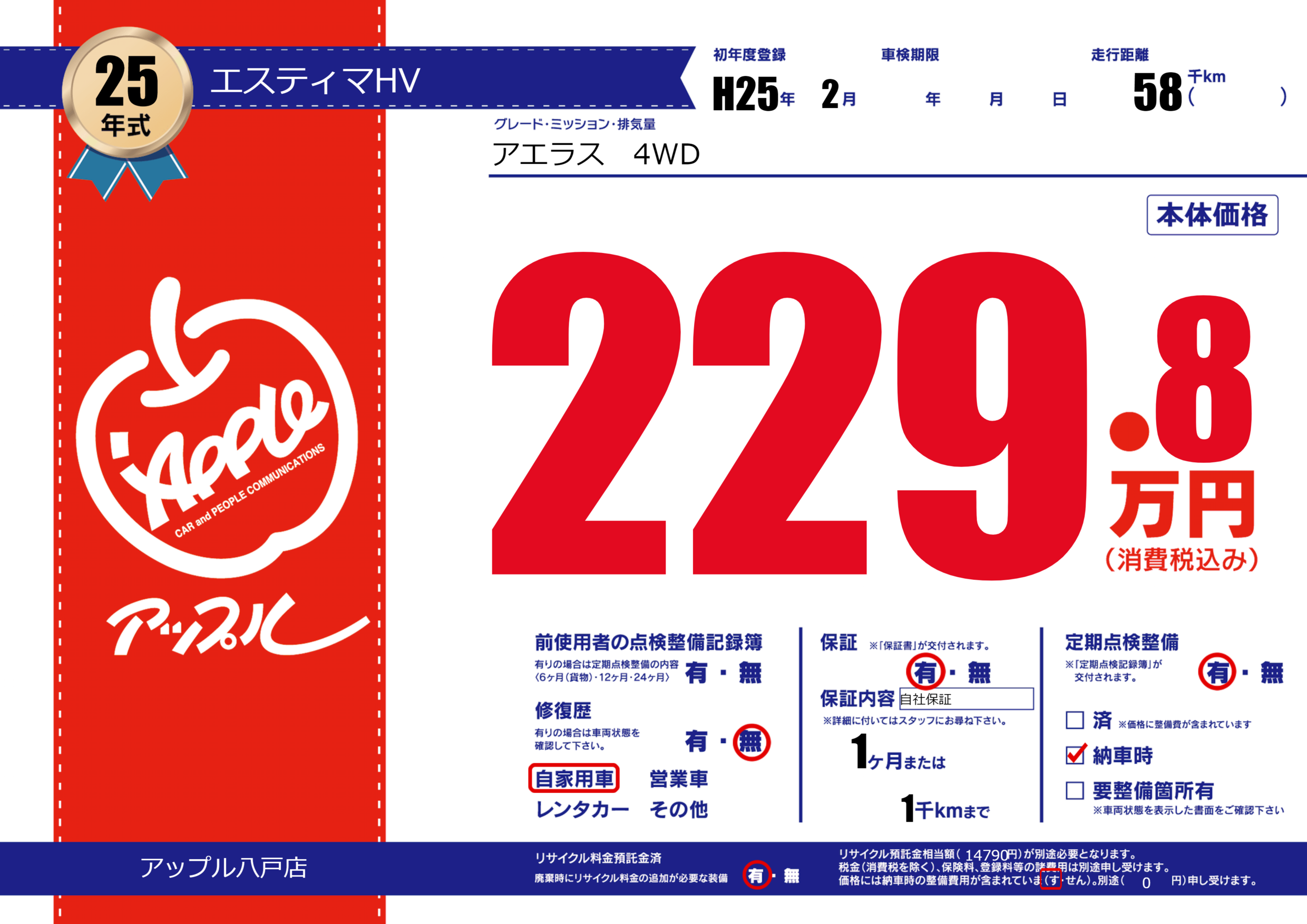 | 車名 | エスティマHV | グレード ミッション 排気量 |