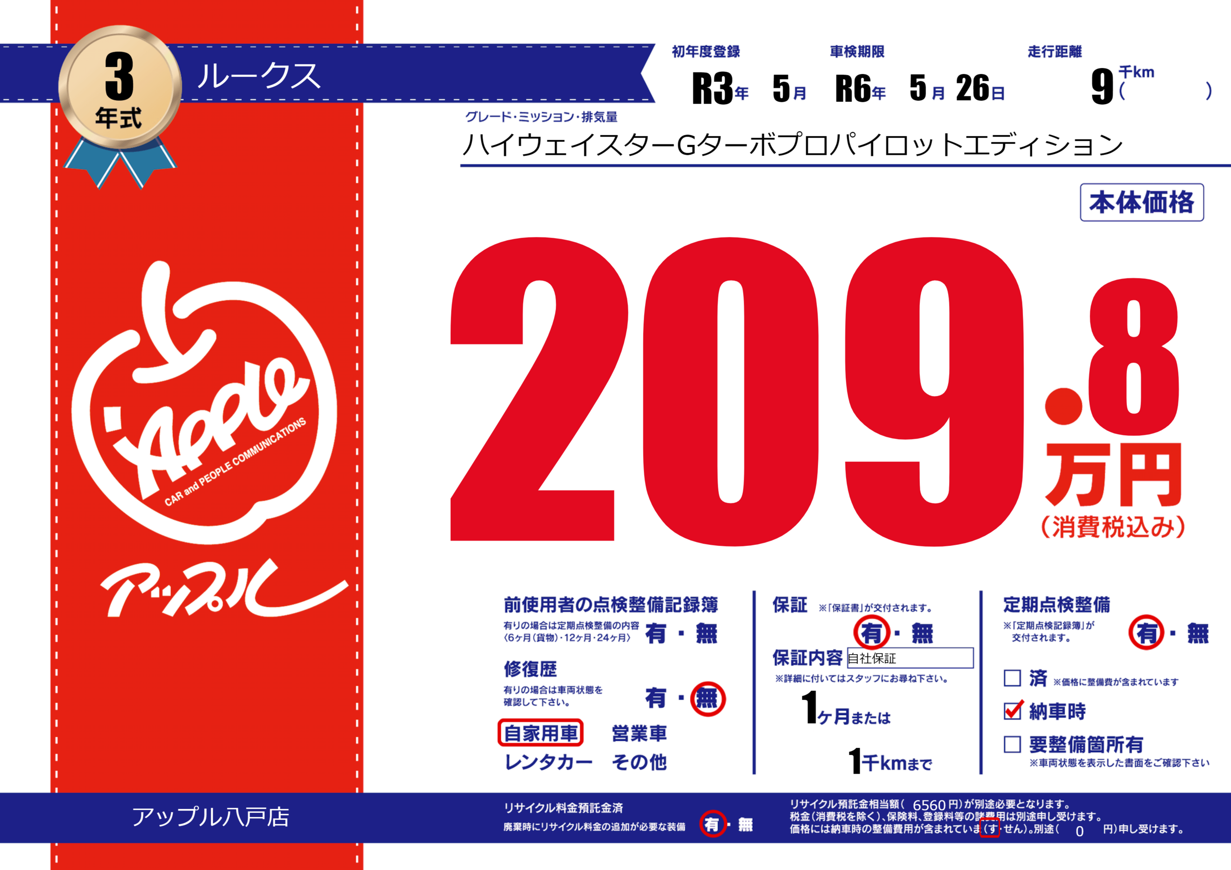 | 走行キロ | 0.9万km | 初年度登録 | R3年5月 |