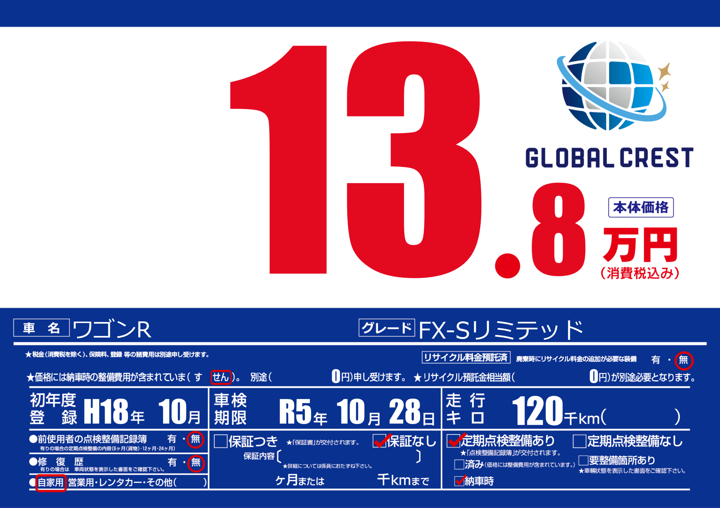 | 走行キロ | 12万km | 初年度登録 | H18年10月 |