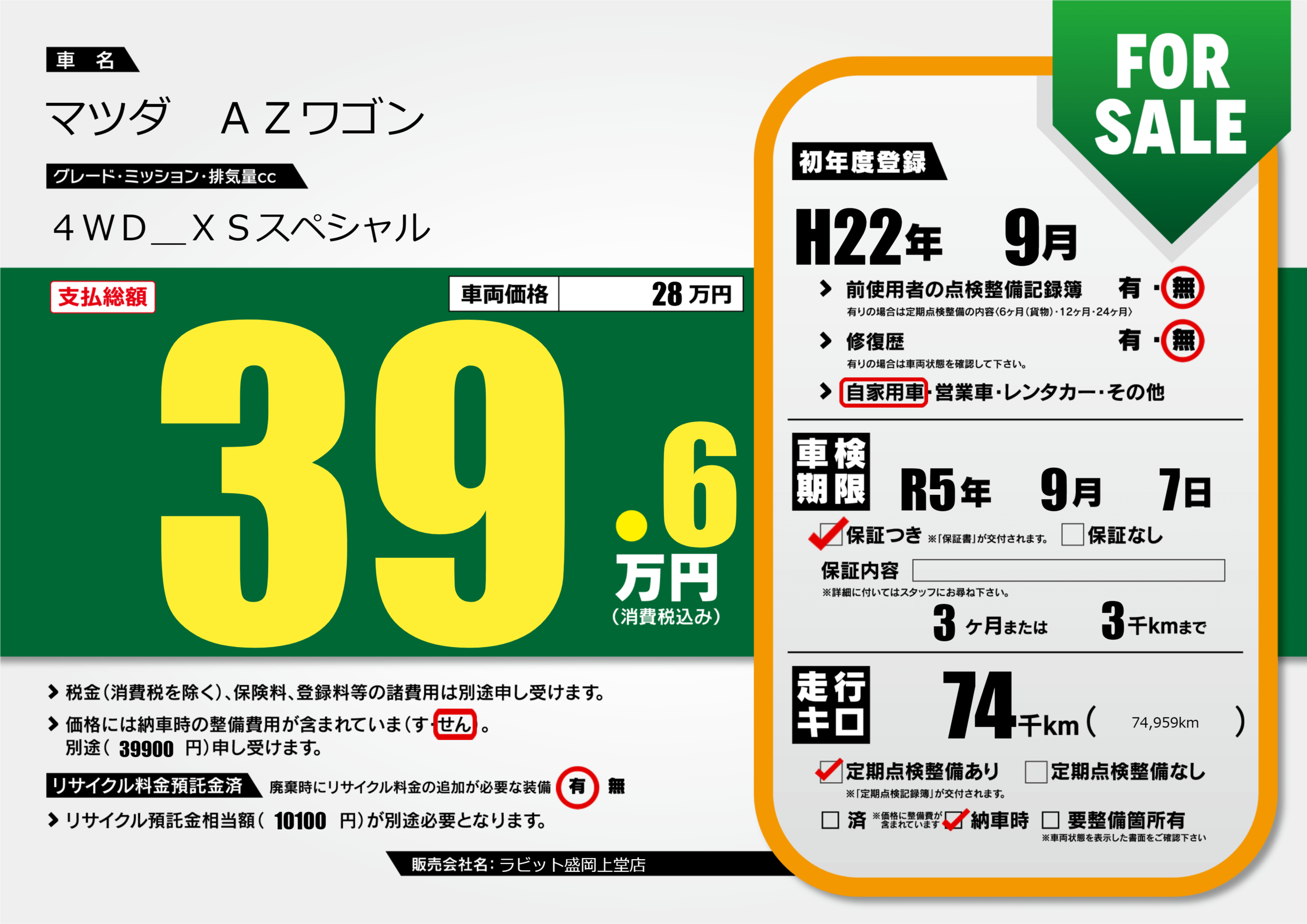 | 走行キロ | 7.4万km | 初年度登録 | H22年9月 |