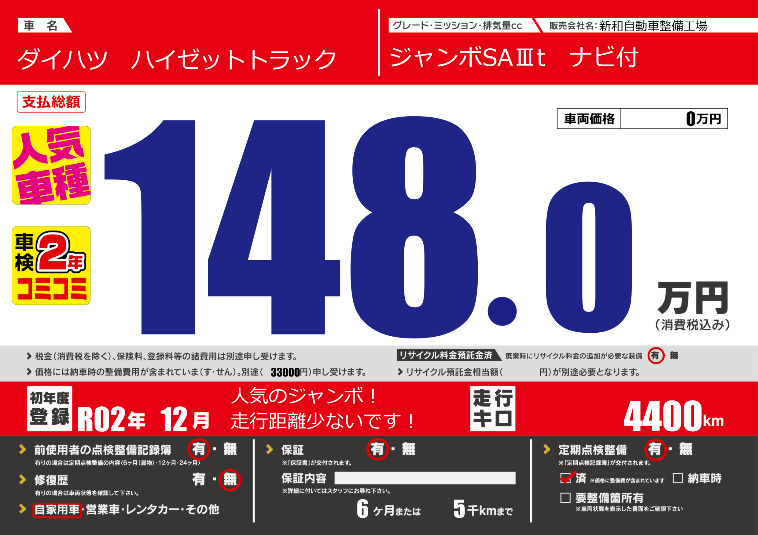 | 定期点検整備 | 定期点検整備あり 定期点検整備済み | ||