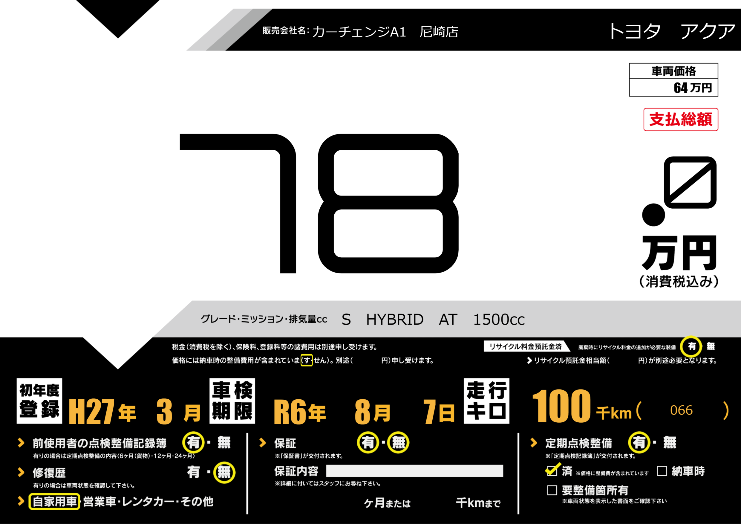 | 定期点検整備 | 定期点検整備あり 定期点検整備済み | ||