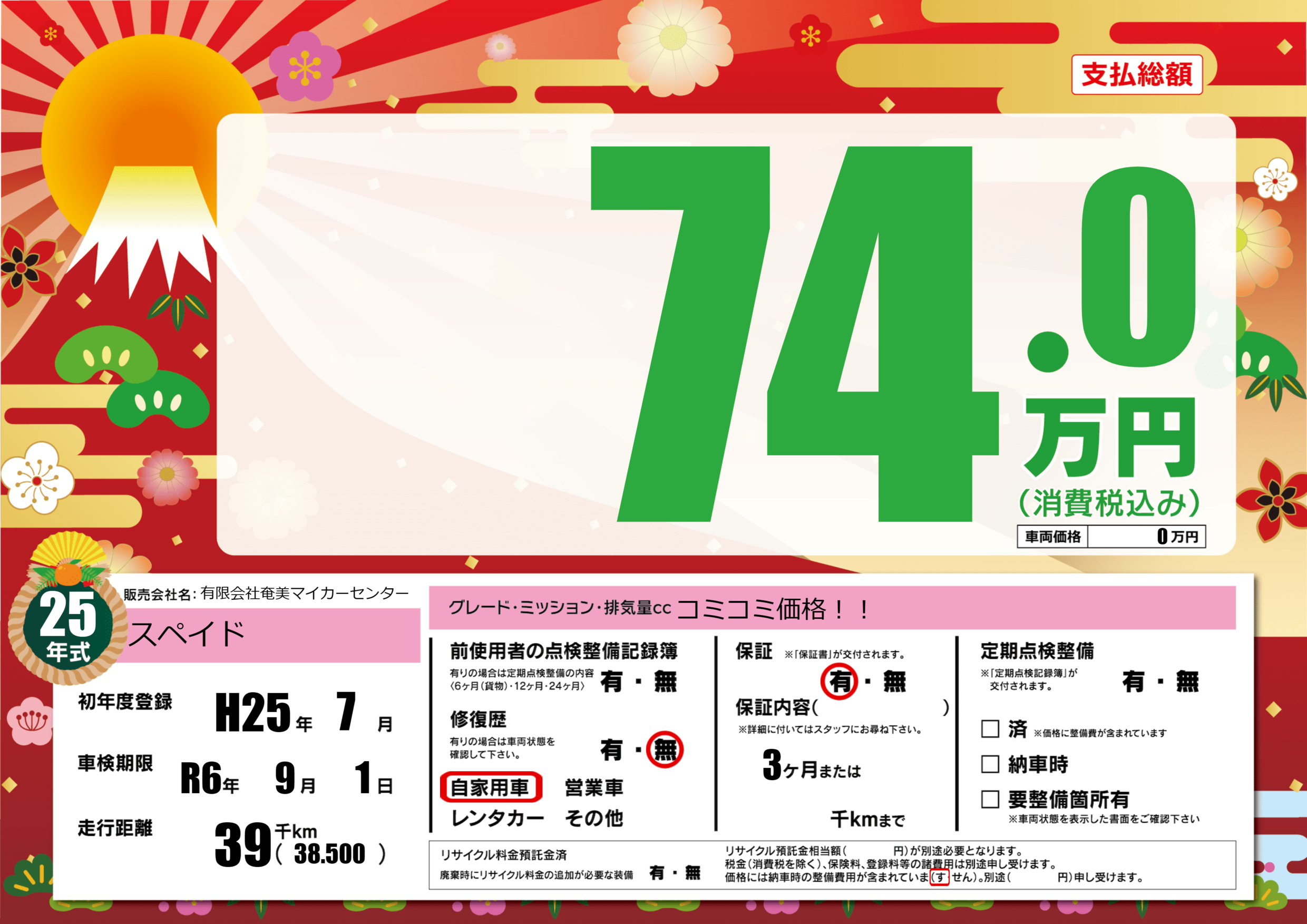 | 走行キロ | 3.9万km | 初年度登録 | H25年7月 |