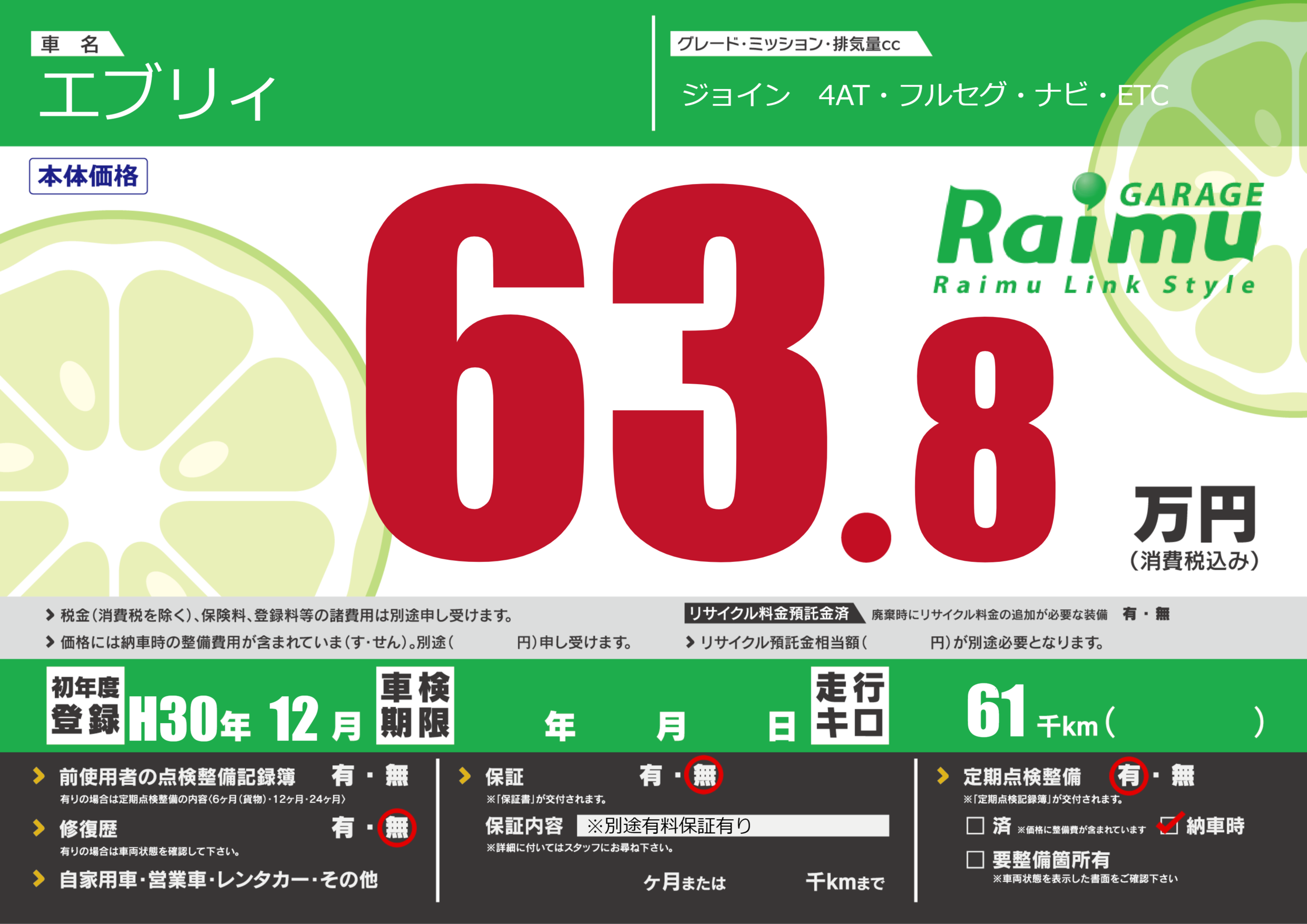 | 定期点検整備 | 定期点検整備あり 納車時あり | ||