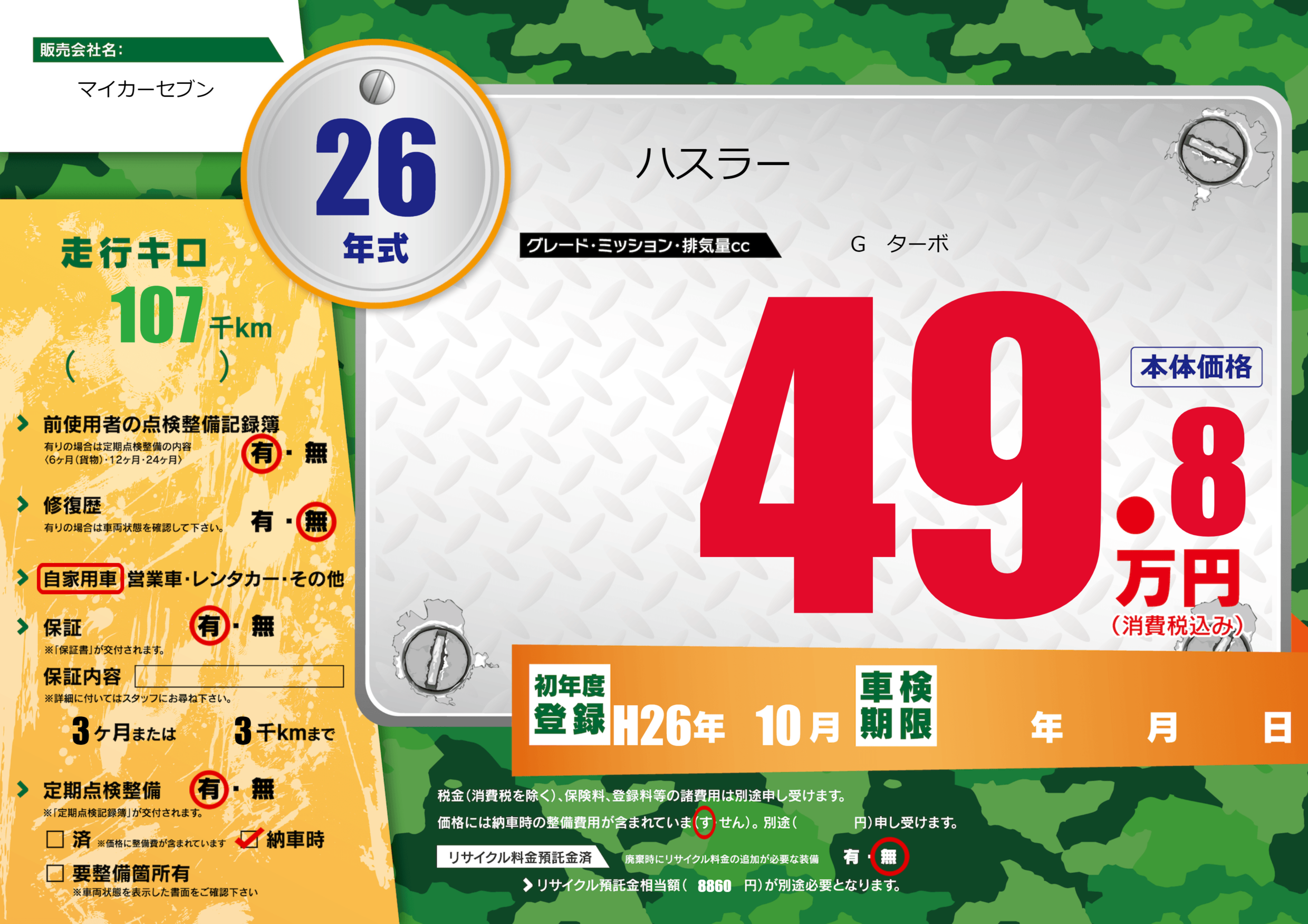 | 車名 | ハスラー | グレード ミッション 排気量 |