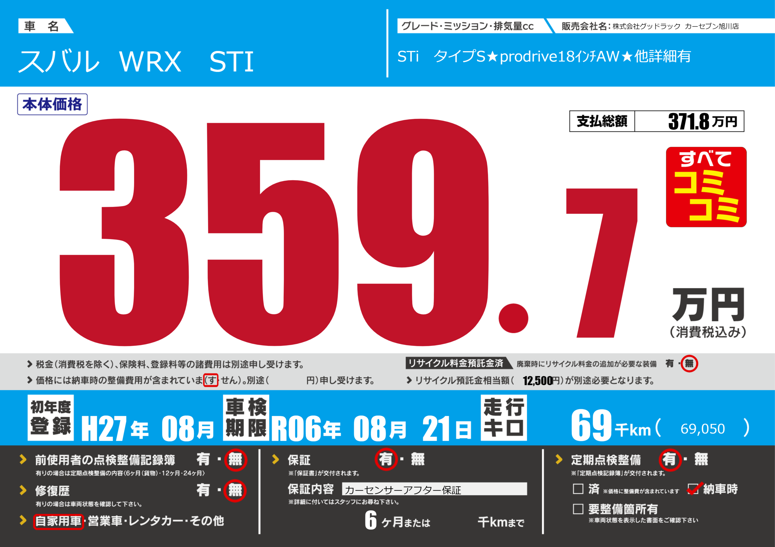 | 車名 | スバル WRX STI | グレード ミッション 排気量 |