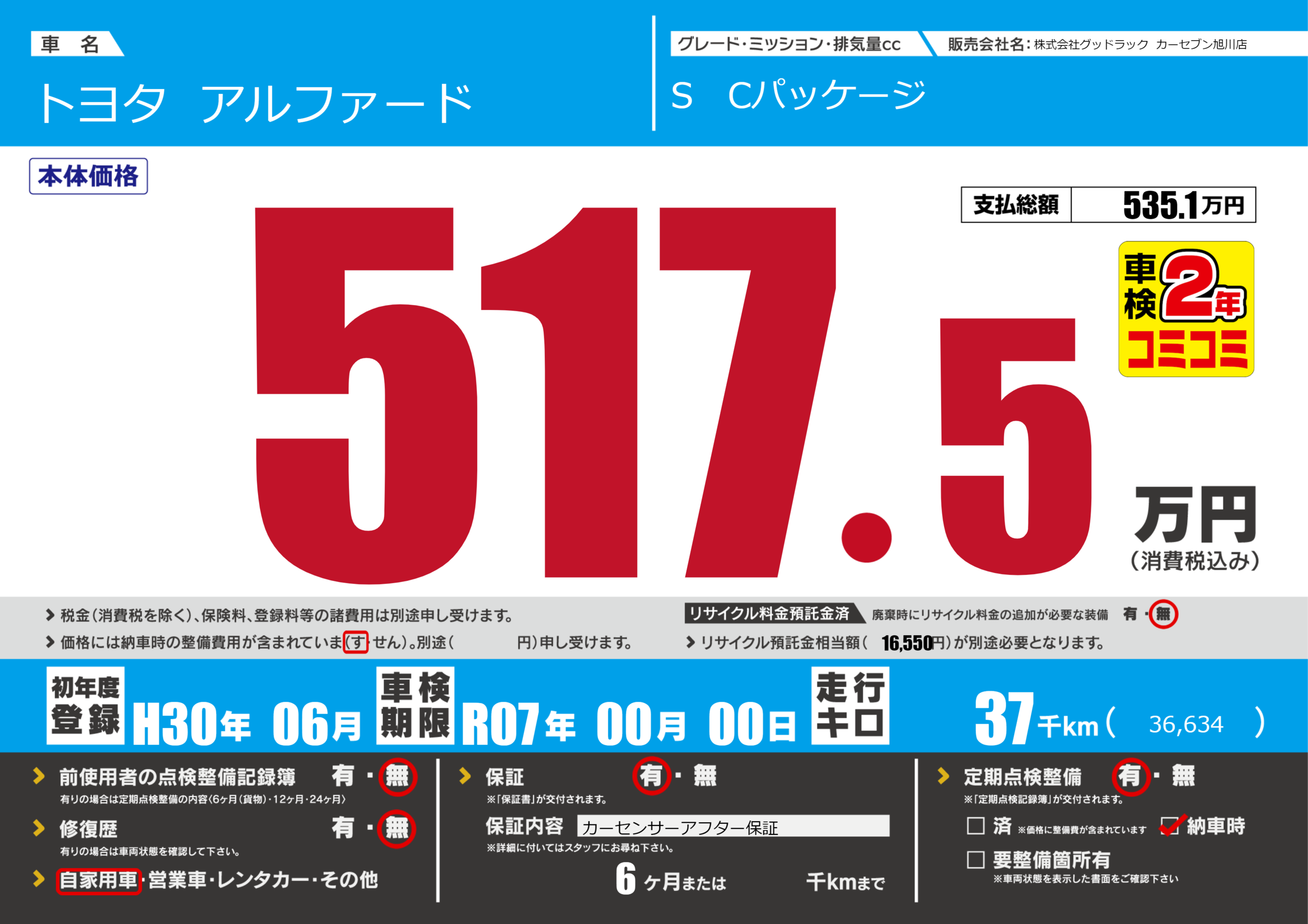 | 車検制限 | R07年 00月 00日 | ||