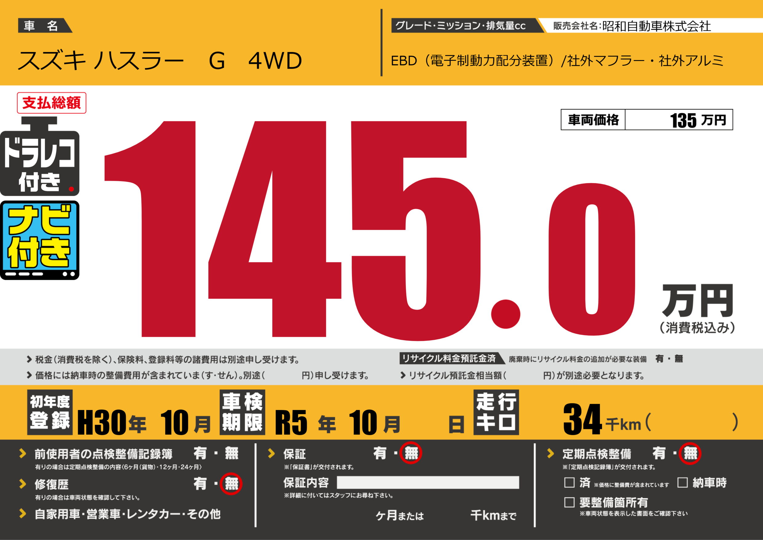 なし | 車検制限 | R5年10月---月 |