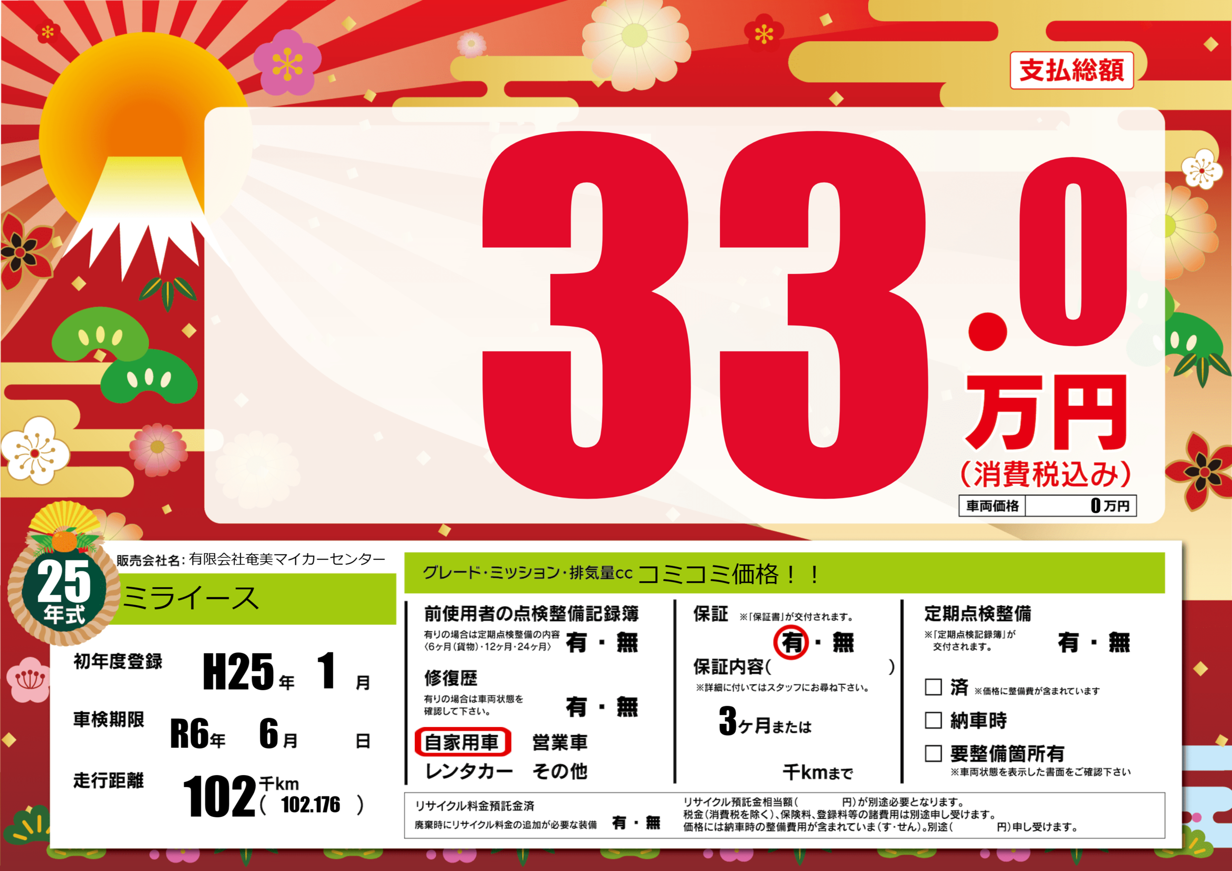 | 走行キロ | 10.2万km | 初年度登録 | H25年1月 |