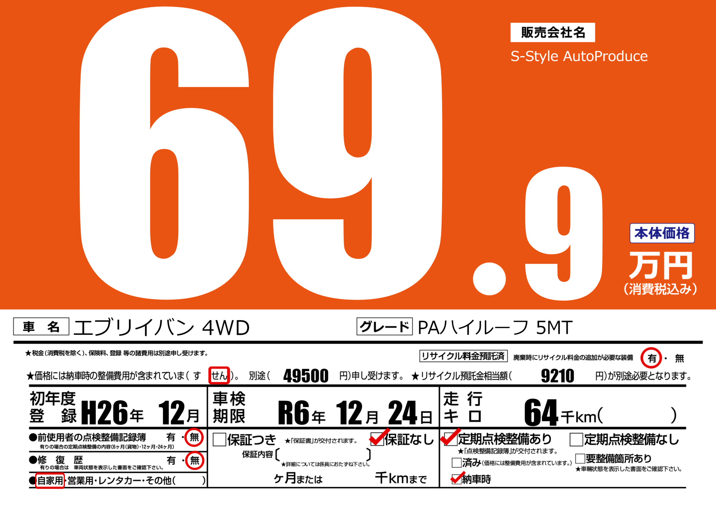 | 車名 | エブリイバン 4WD | グレード ミッション 排気量 |