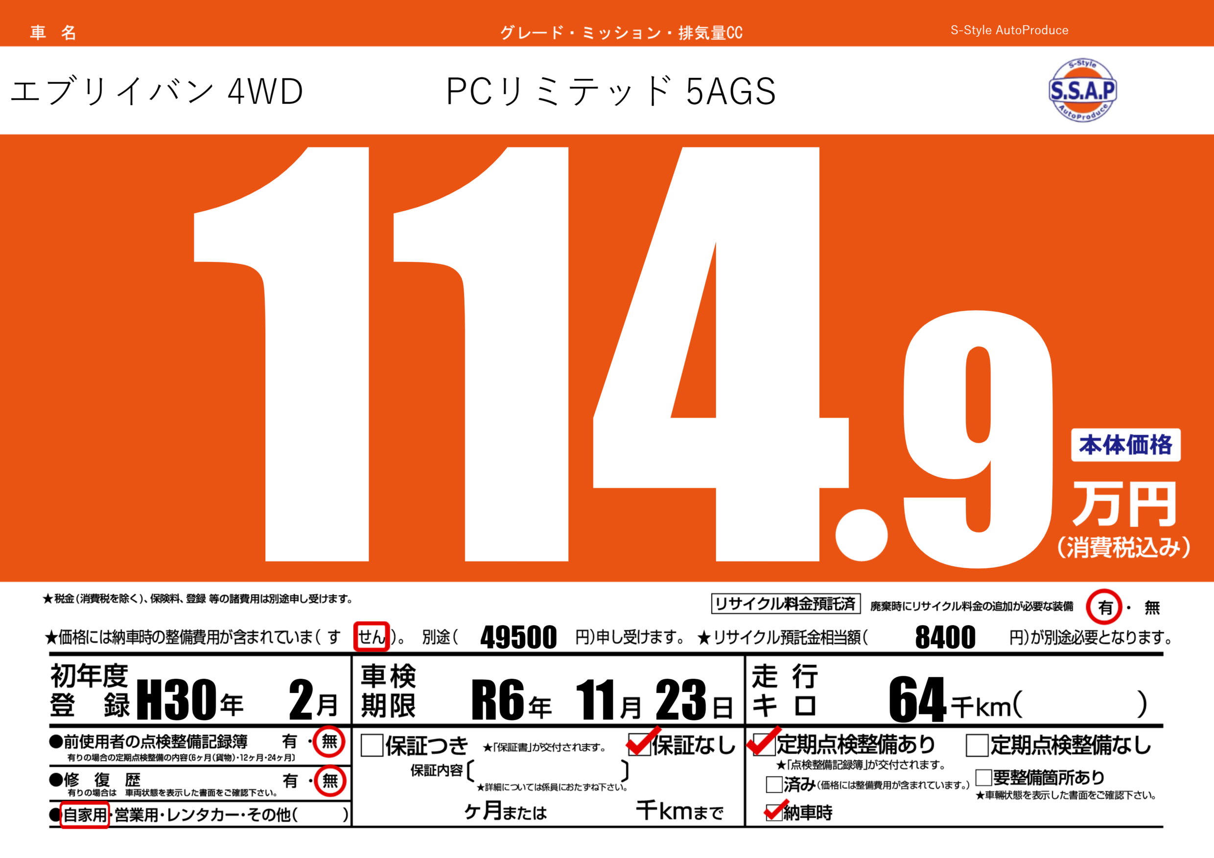 | 車検制限 | R6年 11月 23日 | ||
