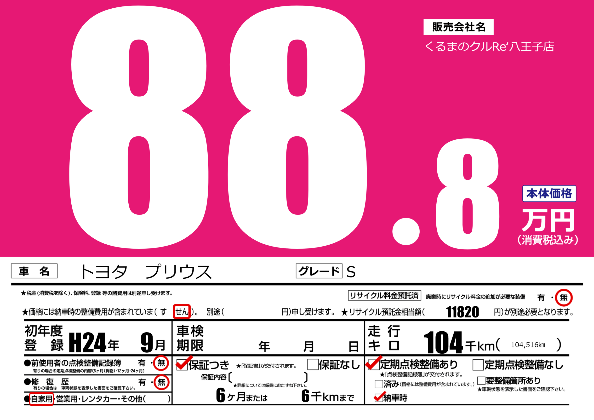 | 車名 | トヨタ プリウス | グレード ミッション 排気量 |
