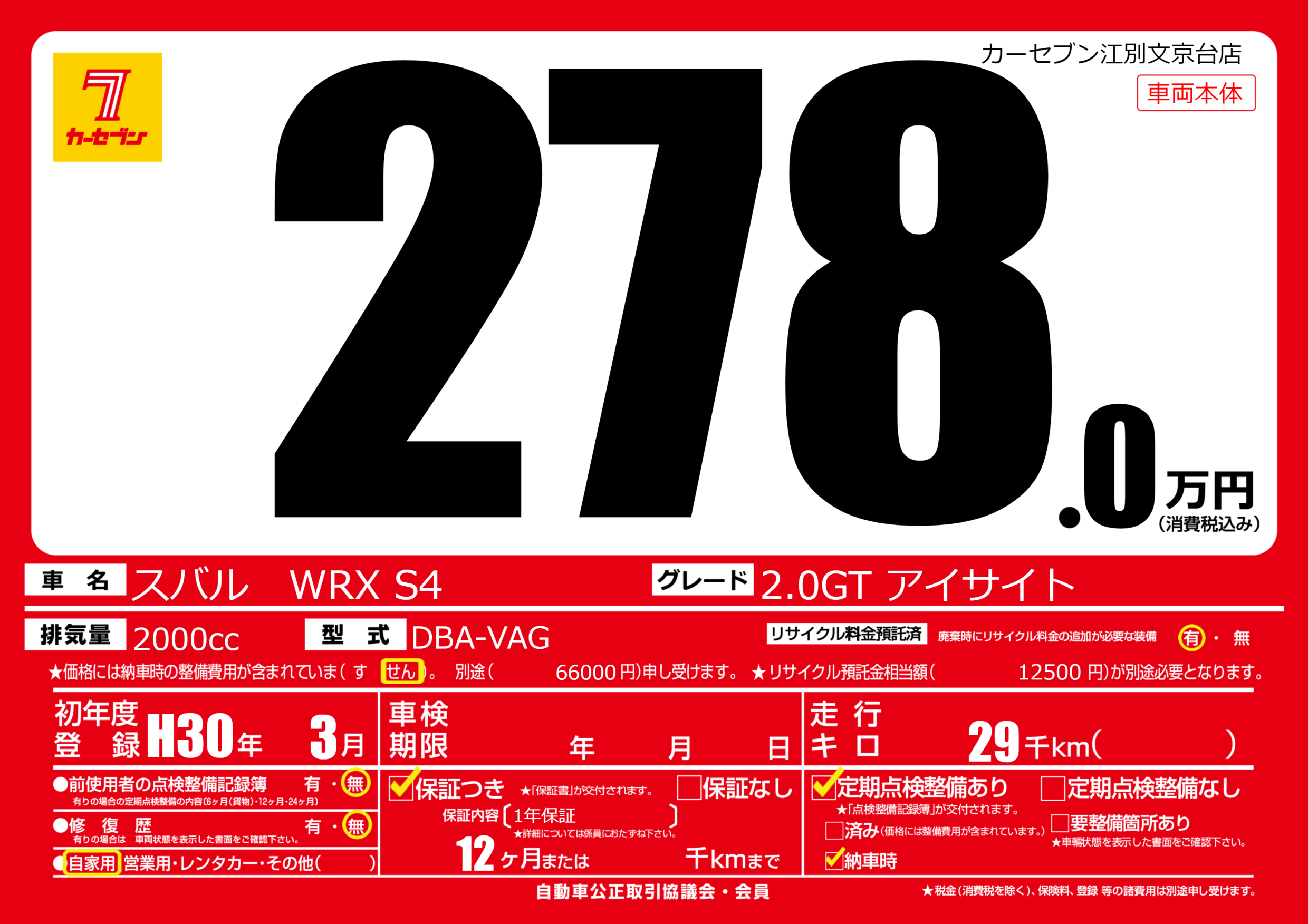 | 車名 | スバル WRX S4 | グレード ミッション 排気量 |