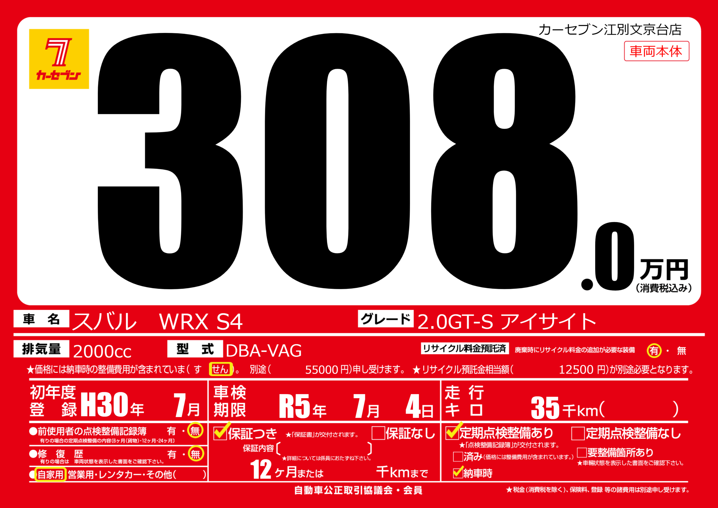 | 車名 | スバル WRX S4 | グレード ミッション 排気量 |