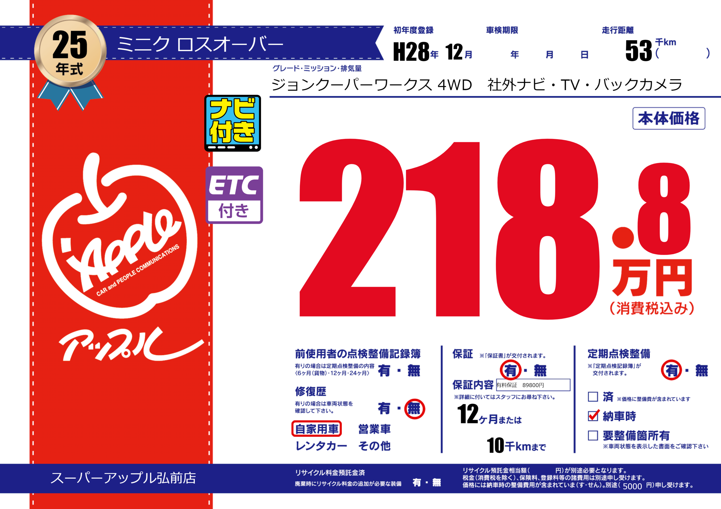 ジョンクーパーワークス 4WD 社外ナビ・TV・バックカメラ |