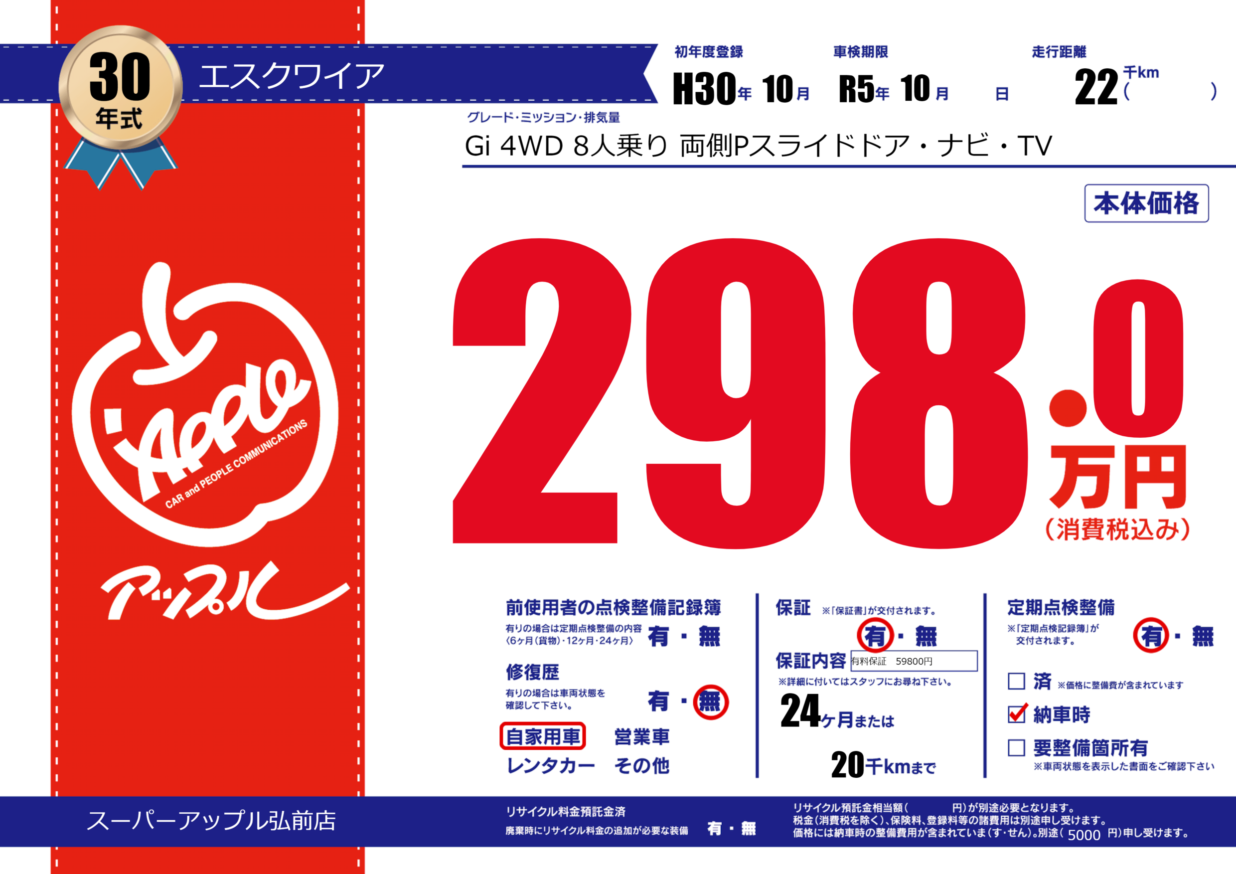 | 走行キロ | 2.2万km | 初年度登録 | H30年10月 |