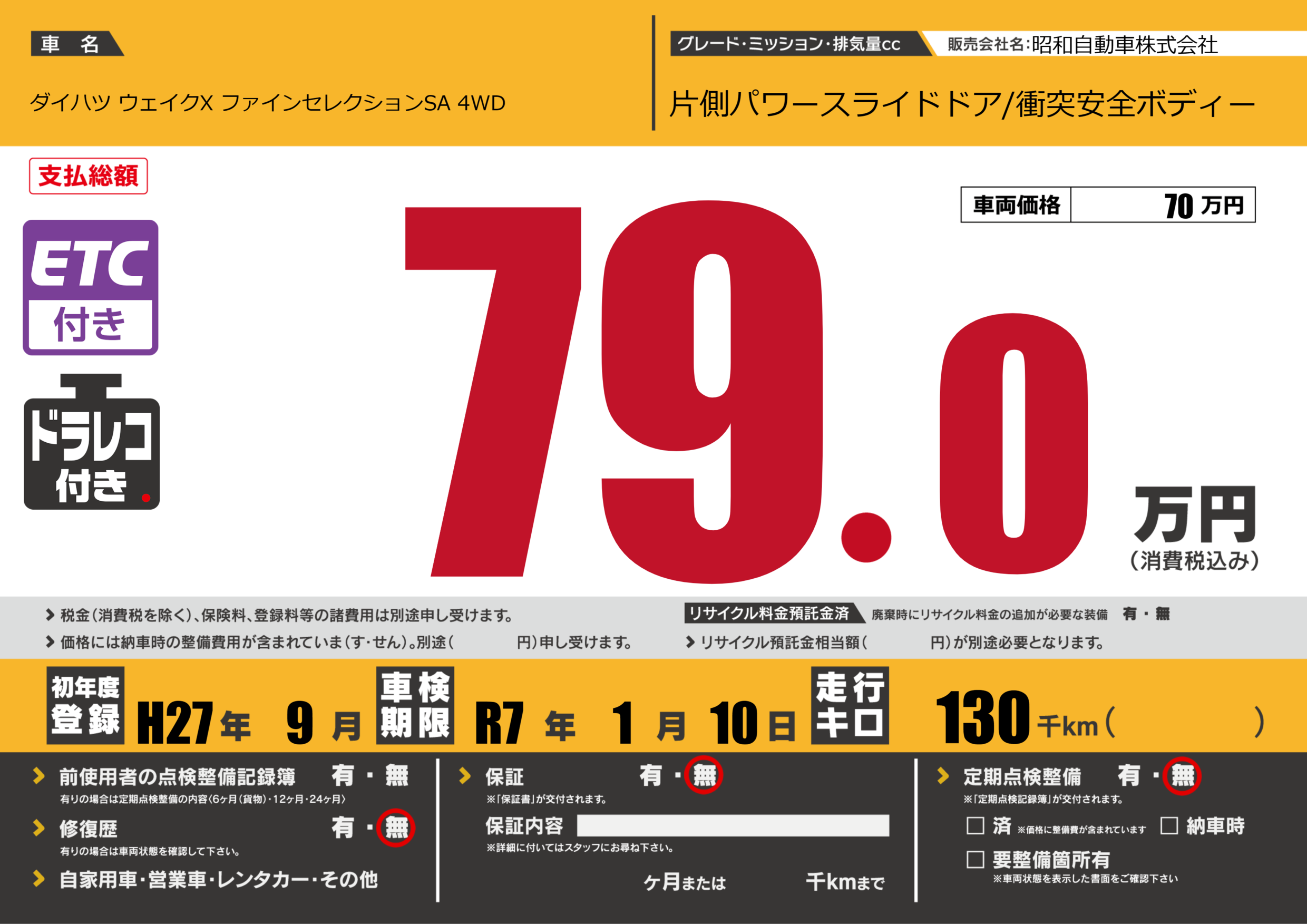 | 車名 | ダイハツ ウェイクX ファインセレクションSA 4WD | グレード ミッション 排気量 |